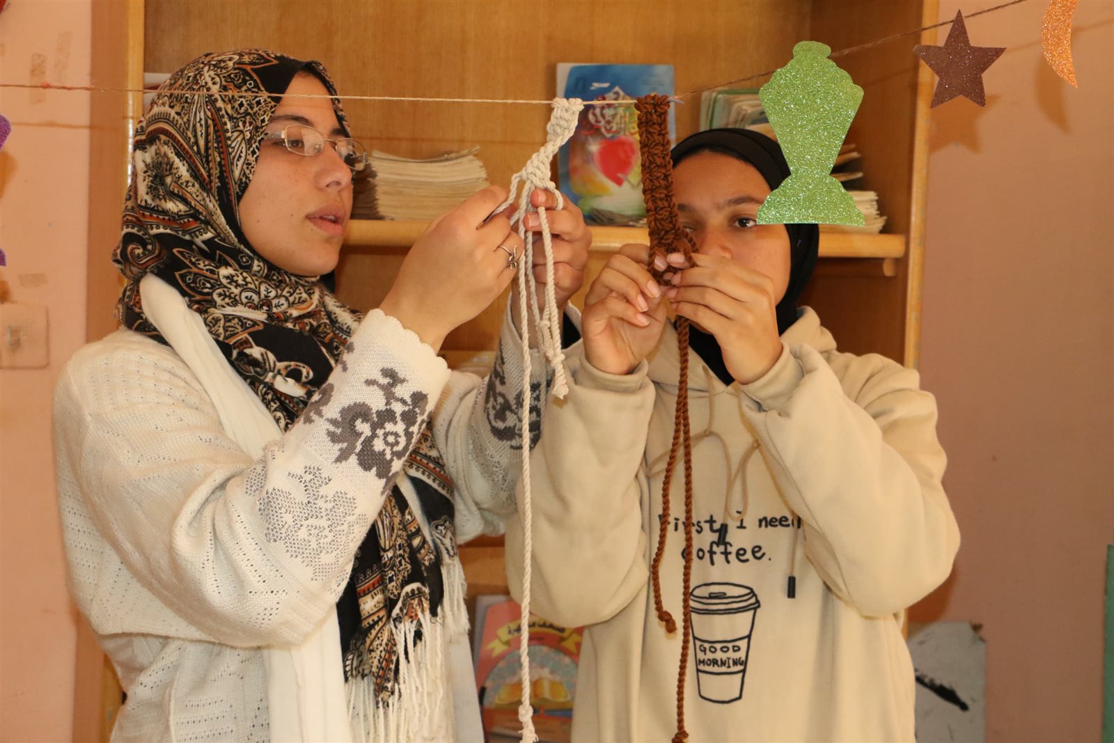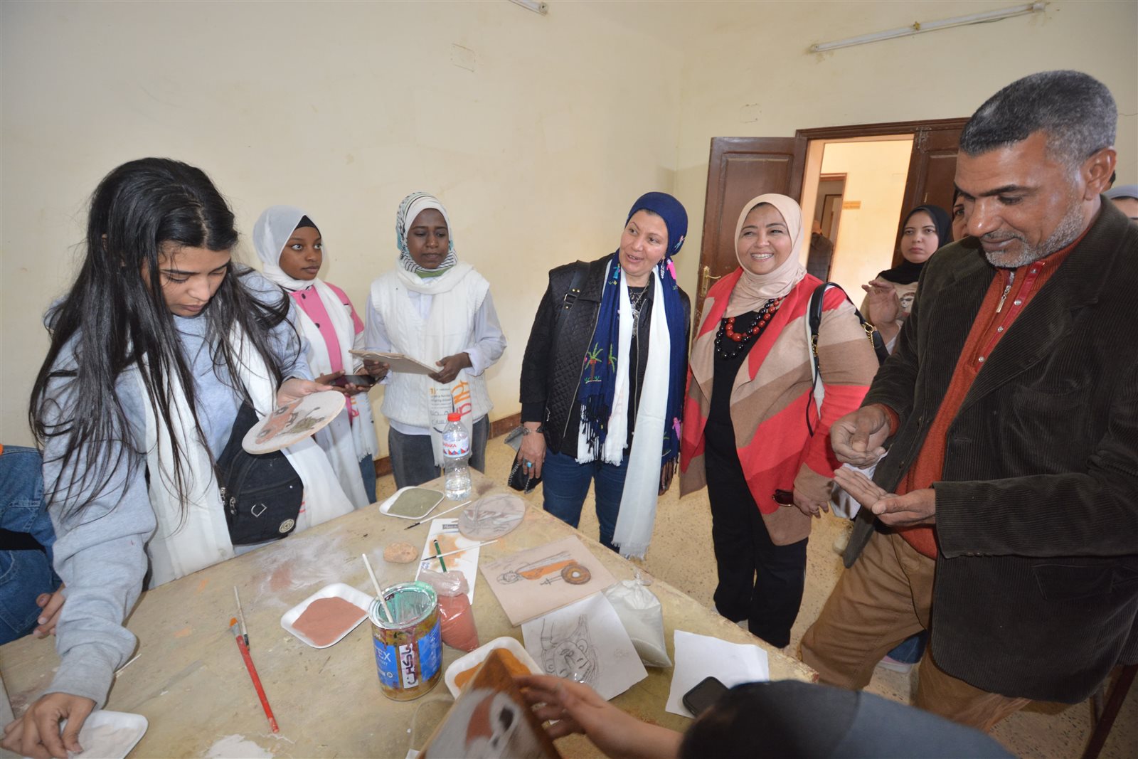 وفي مجال الورش الحرفية، نفذ المدرب محمود دانيال عددا من اللوحات خلال ورشة الرسم على الرمال، من خلال الاستعانة بأحجار ملونة يتم طحنها للرسم بها على اللوحة وتثبيتها بالغراء الأبيض، بينما قام المدرب محمد أبو زيد خلال ورشة الخزف بتدريب الفتيات على كيفية عمل تشكيلات بالطين وزخرفتها كالأواني ووحدات الإضاءة.