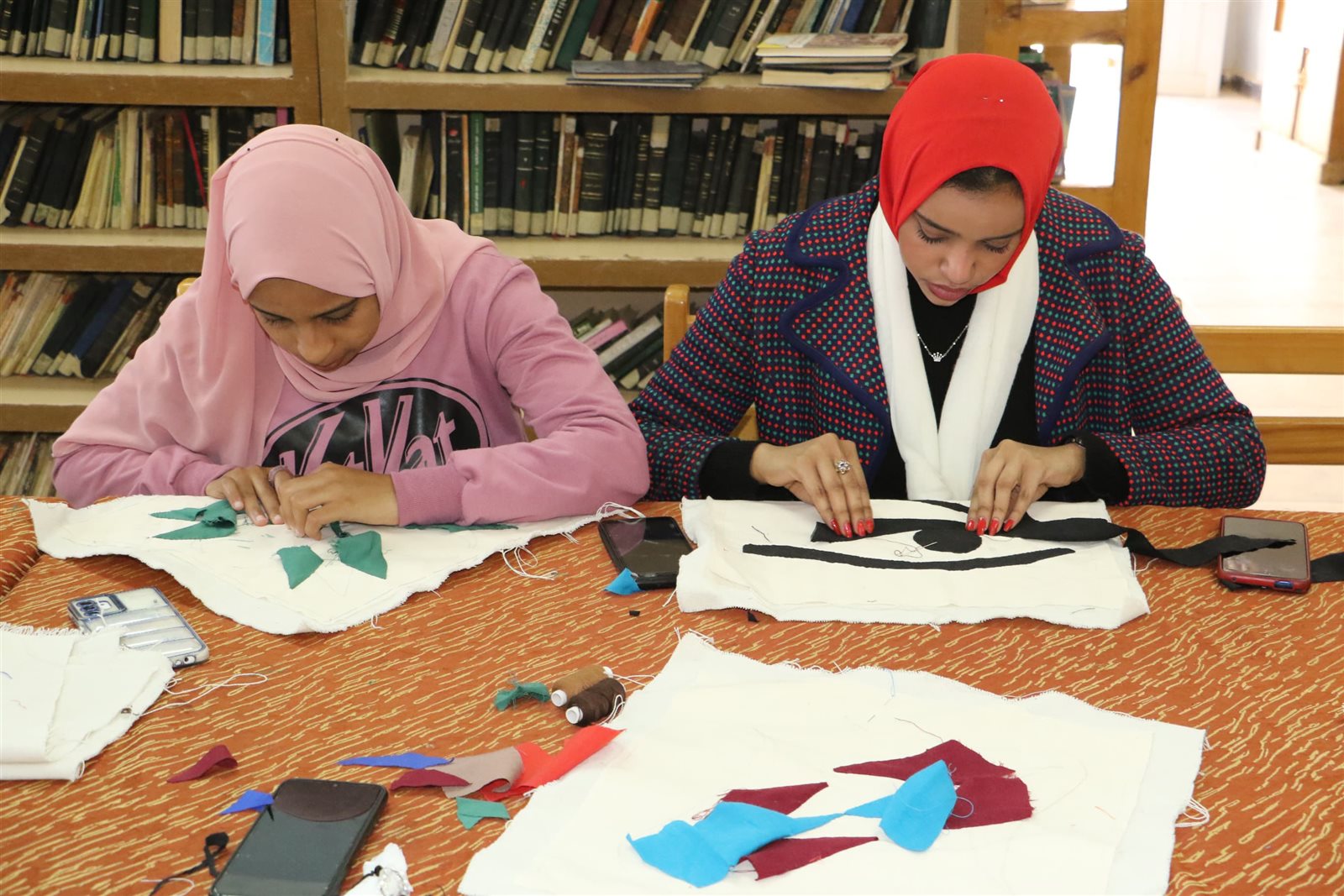 واستكمل المدرب عماد عاشور ورشة "الخيامية" بتعريف الفتيات كيفية التطريز على القماش واختيار الألوان المناسبة لتصميم المفارش والمعلقات.