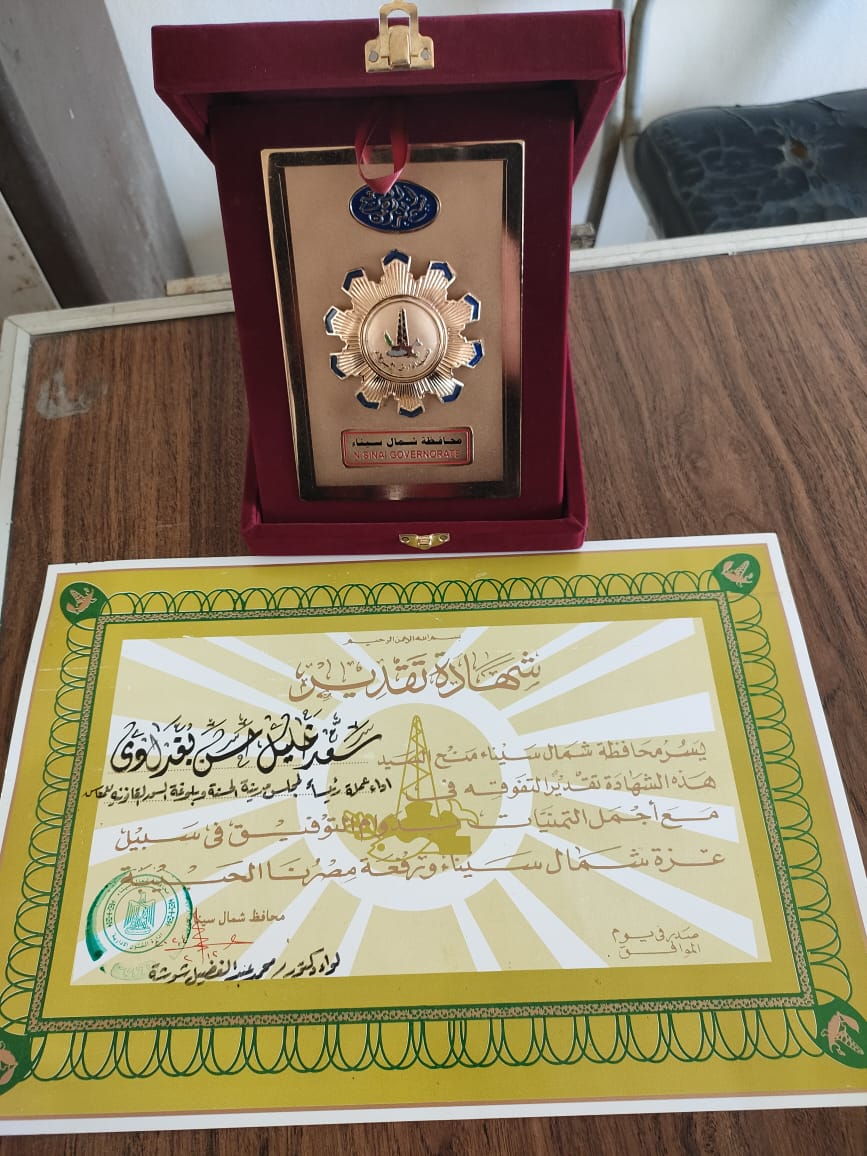 كرَّم اللواء دكتور محمد عبد الفضيل شوشة، محافظ شمال سيناء، المحاسب سعد الدين بغدادي، رئيس مركز ومدينة الحسنة في وسط سيناء، لبلوغه السن القانونية للمعاش، بمنحه شهادة تقدير ودرع المحافظة، تقديرًا لجهوده خلال فترة عمله رئيسا للحسنة.