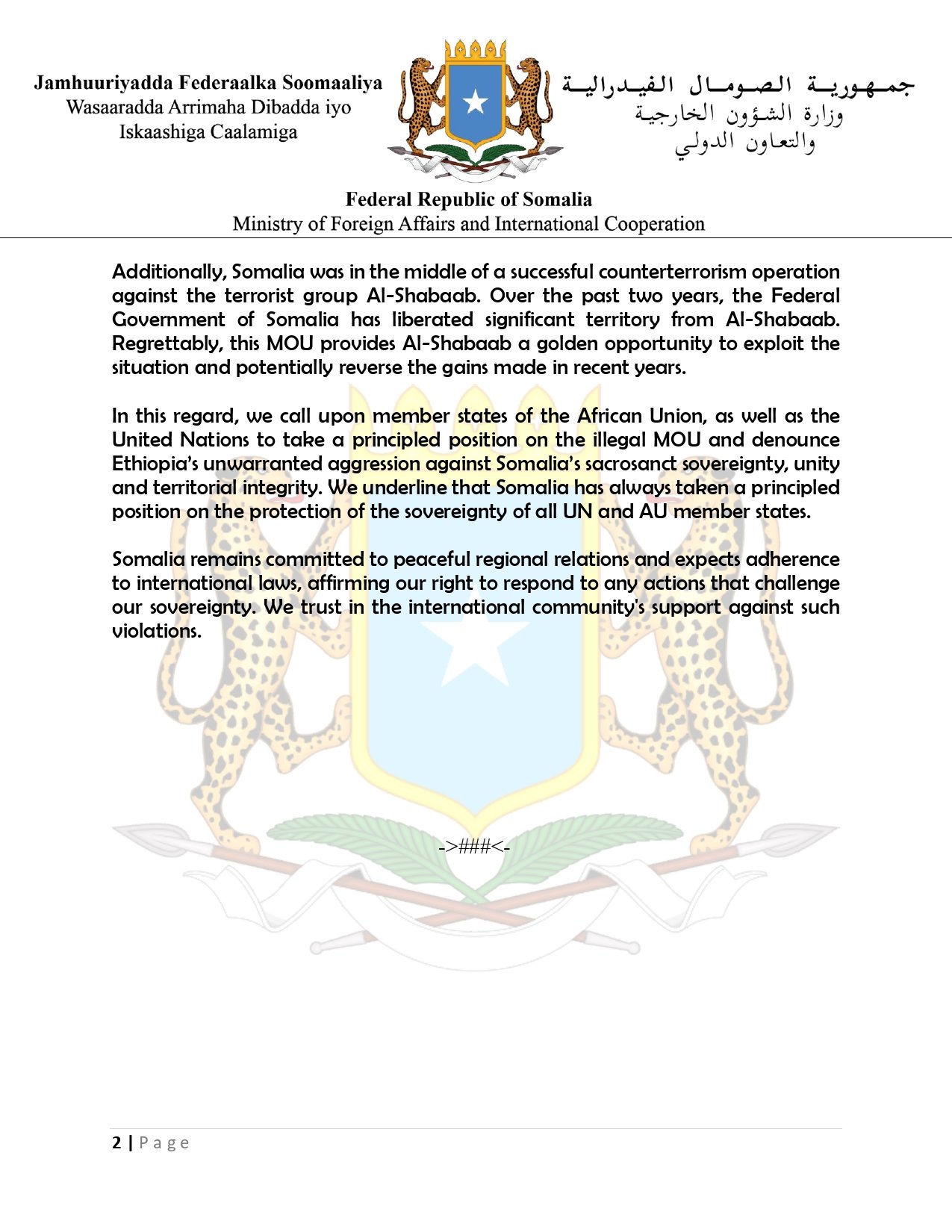 وأشارت إلي أن بناء على ذلك، فإن ما يسمى بـ "مذكرة التفاهم" بين إثيوبيا والإدارة الإقليمية للصومال تعتبر لاغية ولاغية، وسوف تتخذ الصومال جميع التدابير اللازمة لمنع تنفيذ الاتفاق غير القانوني.