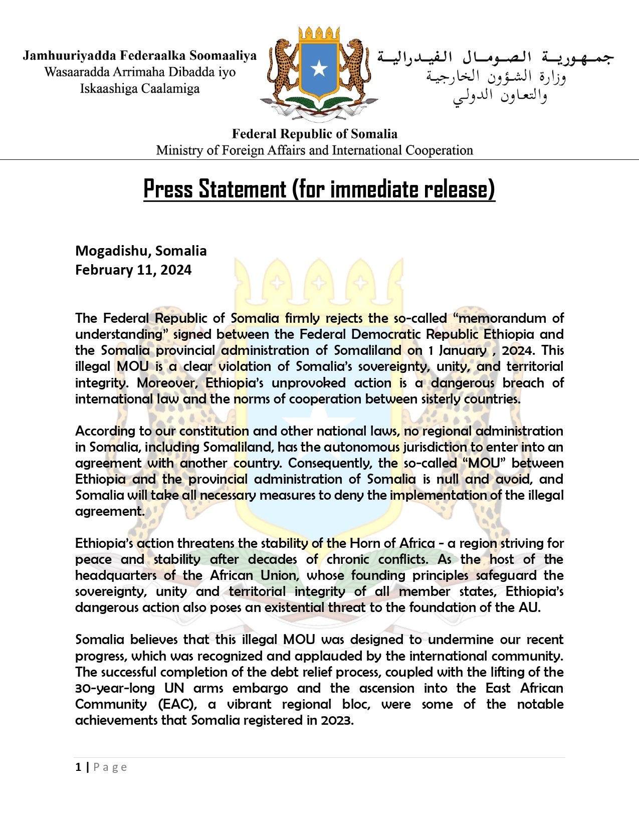 رفضت جمهورية الصومالية، بشدة ما يسمى بـ "مذكرة التفاهم" الموقعة بين جمهورية إثيوبيا الديمقراطية الفيدرالية وصوميالاند في 1 يناير 2024.