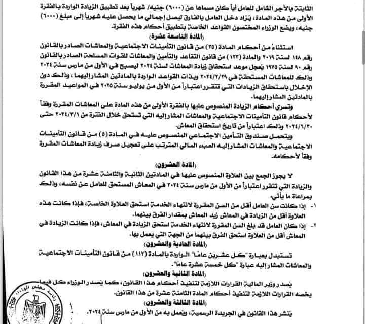 كما نص مشروع القانون بأن يكون الحد الأدنى للزيادة لاصحاب الدرجة السادسة و الخامسة والرابعة 1000 جنيه بعد طرح العلاوة الدورية والحافز الأضافي حسب كل درجة و الباقي يتم إضافة تحت مسمى علاوة الحد الادنى الحزمة الاجتماعية، وكذالك نص أن يكون الحد الادني للزيادة لاصحاب الدرجة الثالثة والثانية والأولي 1100 جنيه بعد طرح العلاوة الدورية والحافز الاضافي حسب كل درجة و الباقي يتم اضافة تحت مسمى علاوة الحد الأدنى الحزمة الاجتماعية .