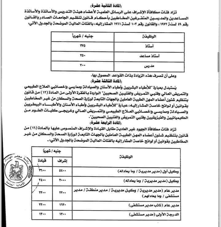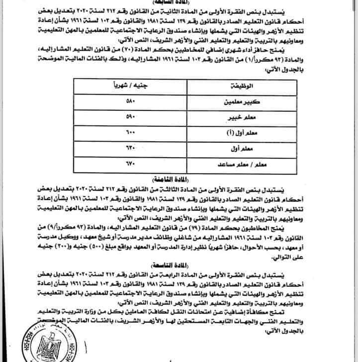 كما نص القانون علي إضافة حافز إضافي، الدرجة الساسة 500 جنيه، الدرجة الخامسة 550 جنيها، الدرجة الرابعة 600 جنيه، الدرجة الثانية 700 جنيه، الدرجة الأولي 750 جنيها.