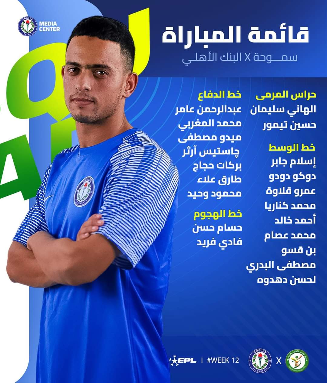 أعلن أحمد سامي المدير الفني للفريق الأول لكرة القدم بنادي سموحة القائمة الأساسية لمواجهة البنك الأهلي، ضمن منافسات الجولة الثانية عشر من عمر مسابقة الدوري المصري الممتاز