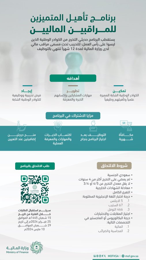 وأعلنت وزارة المالية بالتعاون مع وزارة الموارد البشرية والتنمية الاجتماعية، عبر موقعها الإلكتروني إطلاق النسخة الثالثة من برنامج تأهيل المتميزين للمراقبين الماليين للعام 2024م، والذي يسعى إلى تمكين حديثي التخرج من الجامعات والمؤهلين علمياً من الكوادر الوطنية الشابة، عبر تدريبهم وتطوير قدراتهم وخبراتهم وإكسابهم المعرفة، حيث يتم إلحاقهم بدورات تدريبية إلى جانب تدريبهم على رأس العمل في وزارة المالية، موضحة أن البرنامج يهدف إلى التالي: