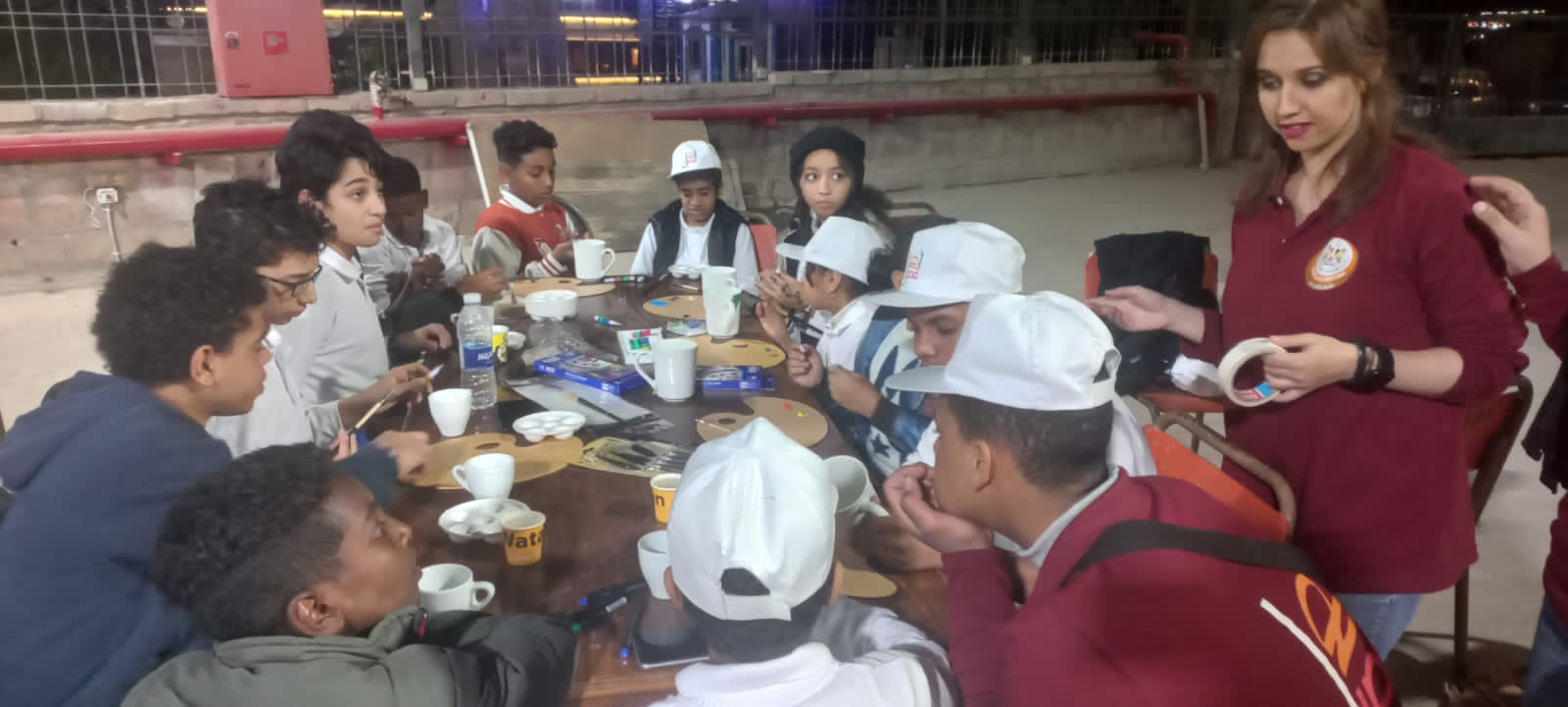 وقامت د. مريم الأمين بتدريب الأطفال على الرسم على الماجات خلال ورشة الرسم على السيراميك، واستكملت د. أميرة سعيد ورشة "اصنع كتابك".