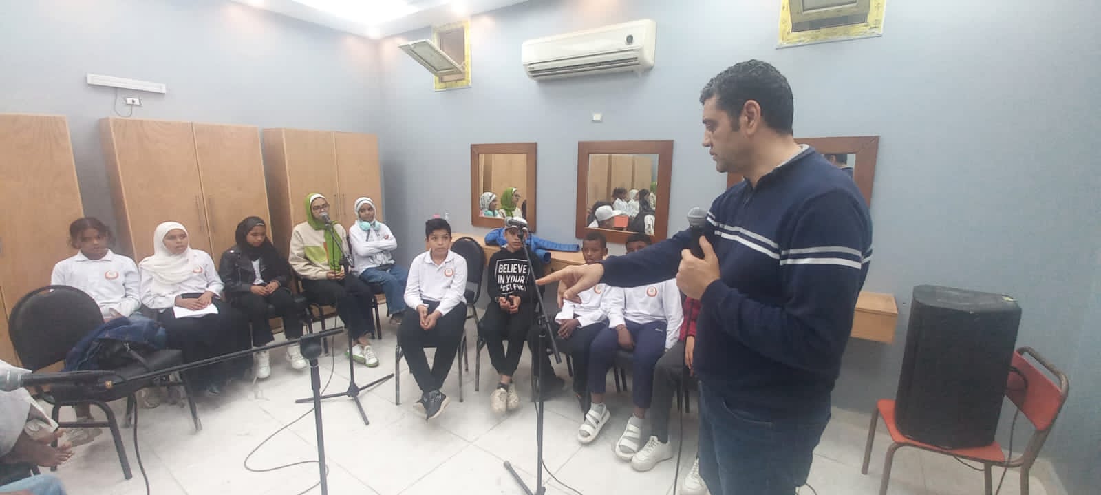 من ناحيته قام الشاعر محمود الحلواني بتدريب الأطفال على أساسيات كتابة الشعر والإلقاء، بجانب مناقشة عدد من القصائد الشعرية.