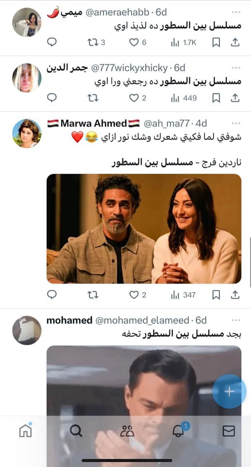 جاءت ردود الفعل على مواقع التواصل الاجتماعي متنوعة من الشباب من الجنسين، فعلى سبيل المثال كتب ياسر حازم على تويتر "بمناسبة مسلسل بين السطور بتاع صبا مبارك حابب أبدي إعجابي بمسيرتها واختياراتها الذكية، وإنها مش بتهدر موهبتها في أعمال كتير .. وغير إنها ممثلة موهوبة ومميزة ومش شبه حد"، وعن رأيه في المسلسل كتب ممدوح "مسلسل بين السطور تحفة"، أما رانون فكتبت "مسلسل بين السطور تعبلي أعصابي. وغيرها الكثير من ردود التفاعلات التي شملت أيضاً أقوال من الحوار الدائر بين أبطاله. مسلسل بين السطور هو النسخة المصرية للمسلسل الكوري Misty، قامت بالمعالجة الدرامية والإشراف على الكتابة السيناريست نجلاء الحديني، تطوير ورشة سرد، إخراج وائل فرج، وبطولة النجمة صبا مبارك، أحمد فهمى، محمد علاء، وليد فواز، ناردين فرج، باسل الزارو، على الطيب، ودنيا المصرى