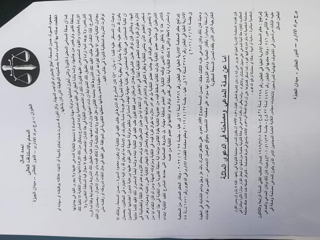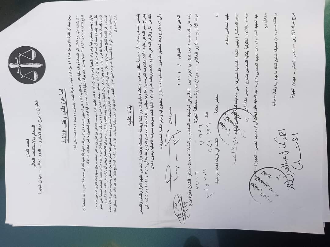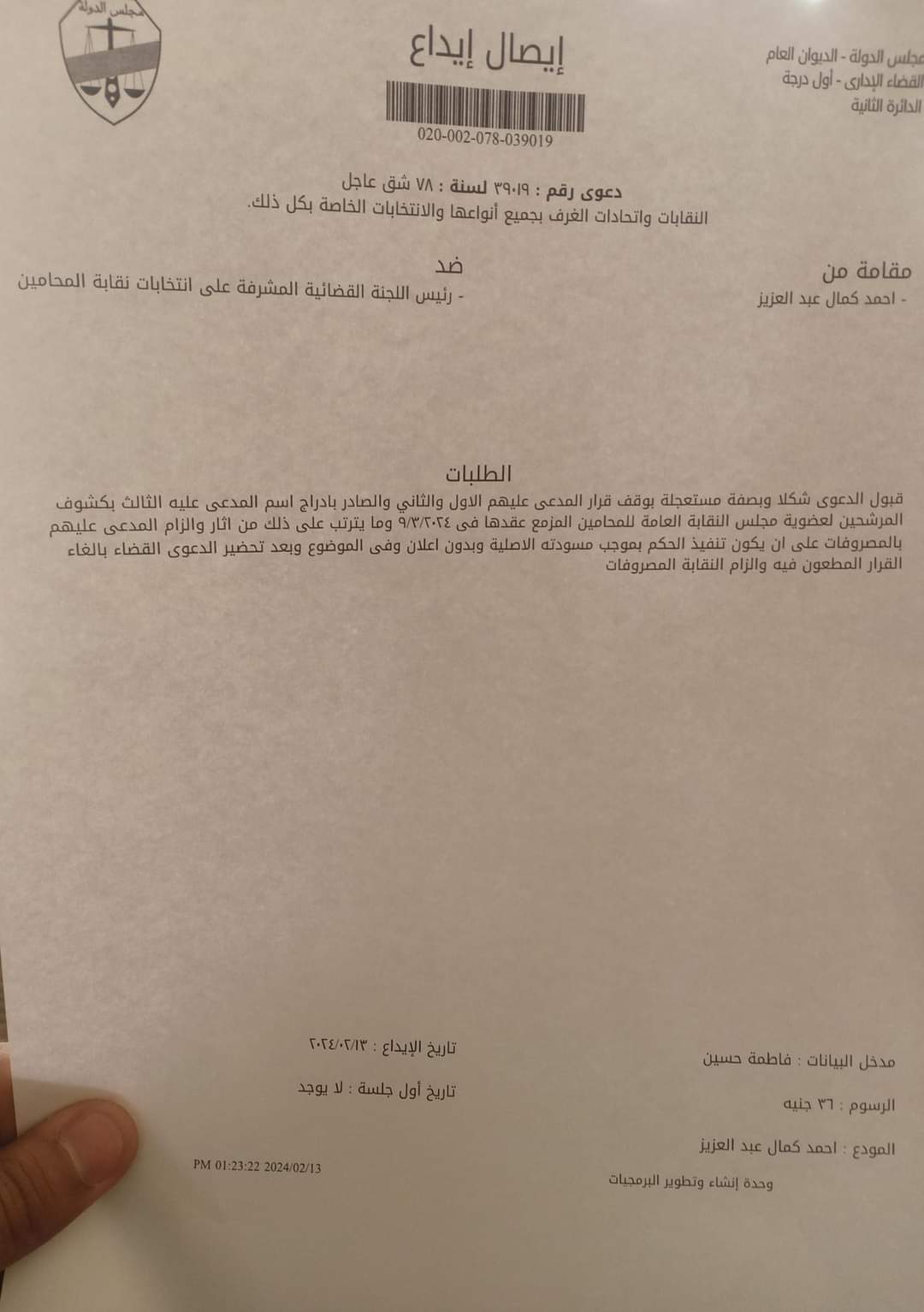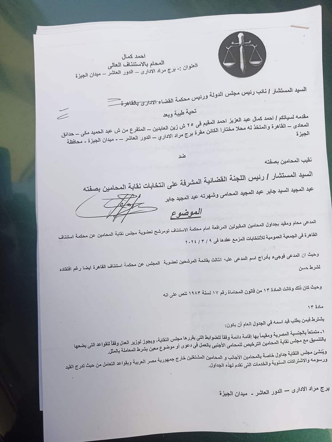 وطالب احمد كمال المحامي، بقبول الدعوى شكلا وبصفة مستعجلة ووقف إدراج اسم عبد المجيد جابر، بكشوف المرشحين لعضوية مجلس النقابة العامة للمحامين المزمع عقدها في 9/3/٢٠٢٤.