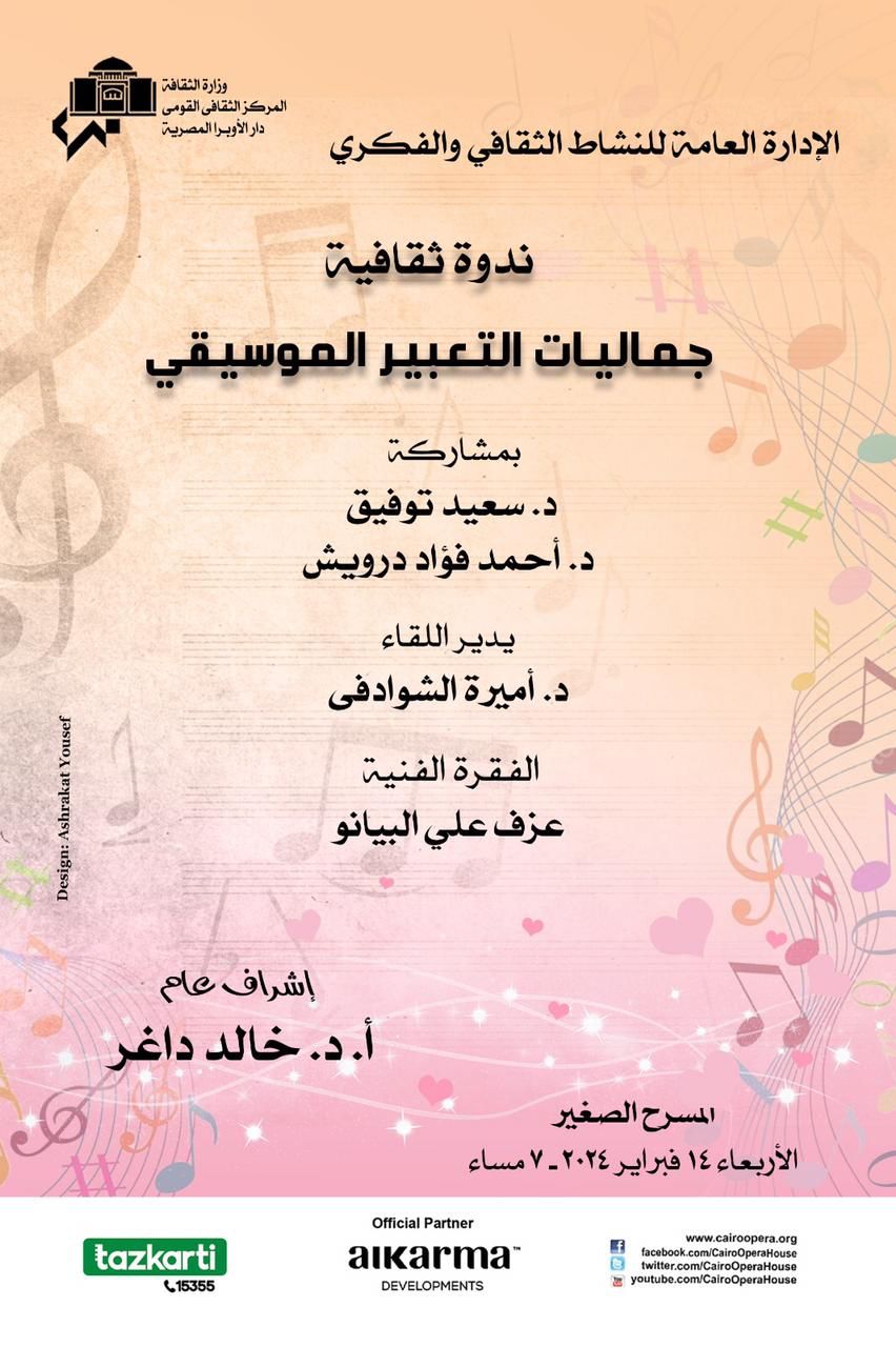 تتواصل فعاليات الثقافة المصرية الهادفة إلى تطوير وعى المجتمع والارتقاء بالوجدان، حيث تعقد دار الأوبرا برئاسة الدكتور خالد داغر ضمن نشاطها الثقافى والفكرى ندوة بعنوان جماليات التعبير الموسيقي.