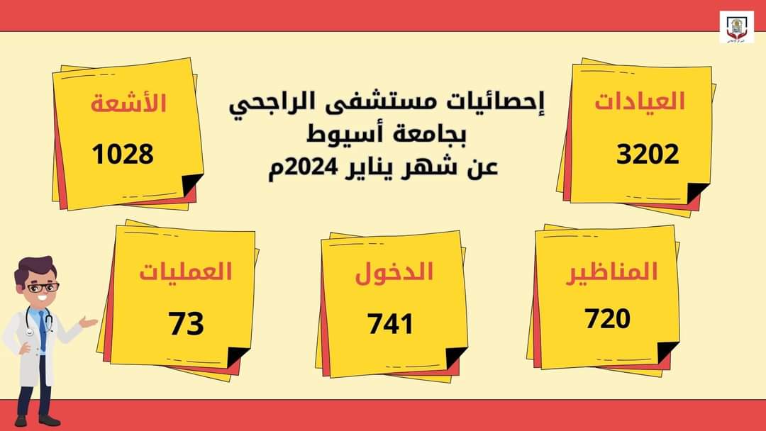 كشفت مستشفى الراجحي الجامعي بأسيوط، بأنه تم استقبال 1028 حالة في بوحدة الأشعة، وسجلت 720 حالة في بوحدة المناظير. كما تم تسجيل دخول 741 حالة، وإجراء 73 عملية جراحية خلال الشهر الماضي.