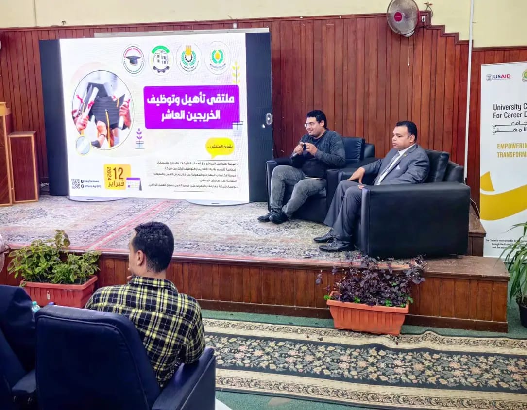 و تحدث الدكتور محمد عبد العظيم نائب رئيس الجامعة حول الدور المحوري الذى تقدمه ملتقيات التوظيف في أن تكون همزة الوصل بين الطلاب والخريجين من جهة ومؤسسات العمل من جهة أخرى، وحث الطلاب والخريجين على بذل الجهد في التدريب والتعلم لتحسين مهاراتهم الشخصية والتقنية، ليصبحوا على مستوى عالي من الكفاءة يجمع ما بين الخلفية العلمية والقدرة العملية لضمان الحصول على أفضل الفرص الوظيفية المتاحة، ومواكبة متطلبات سوق العمل الذي يشهد تغيرات عديدة متلاحقة.