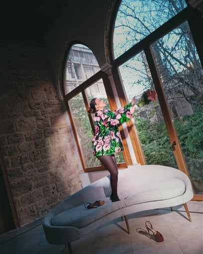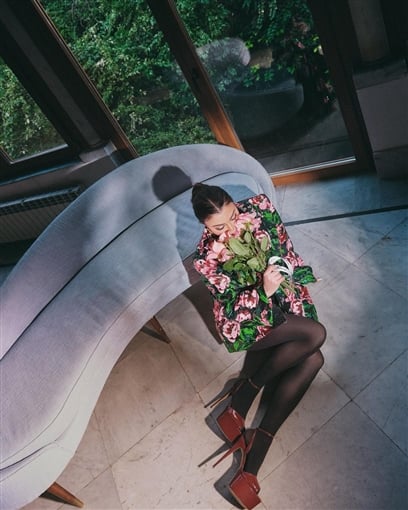 وظهرت هيفاء وهبي، وهي ممسكة بباقة من الورود، ومرتدية جاكيت من تصميم دار أزياء Dolce & Gabbana، قصير يصل للفخذ مطبوع عليه نفس الورود التي تحملها باللون الودي مع الأخضر، ونسقت معه شراب أسود، وانتعلت حذاء ذا كعب عالٍ باللون الأحمر.