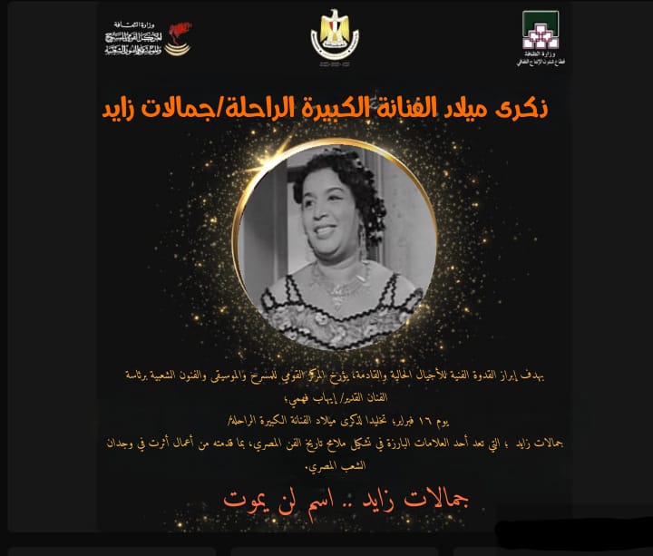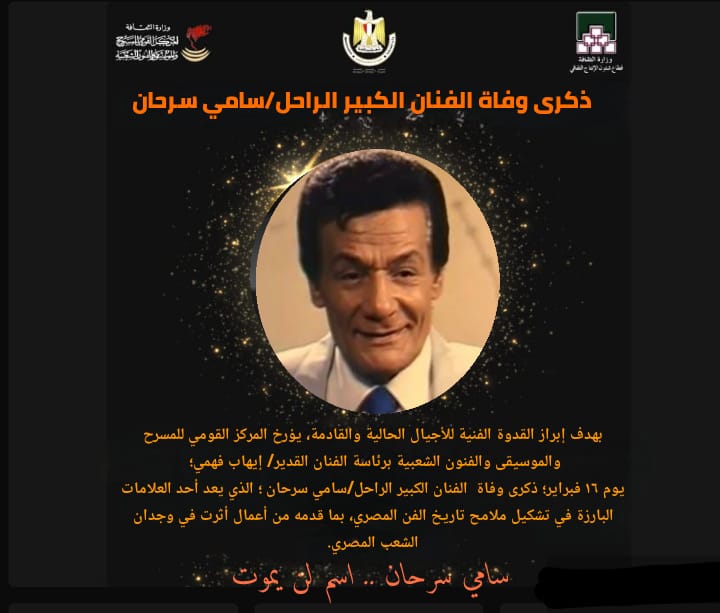 يستمر المركز القومي للمسرح والموسيقى والفنون الشعبية برئاسة الفنان إيهاب فهمي، في التأريخ الموثق لذكرى ميلاد ووفاة الراحلين من القامات الفنية المصرية، وذكرى ميلاد الفنانين الحاليين المستمرين في عطائهم الفني - أطال الله عمرهم جميعا، وذلك تحت رعاية وزيرة الثقافة الدكتورة نيفين الكيلاني، وإشراف رئيس قطاع شئون الإنتاج الثقافي المخرج الكبير خالد جلال.