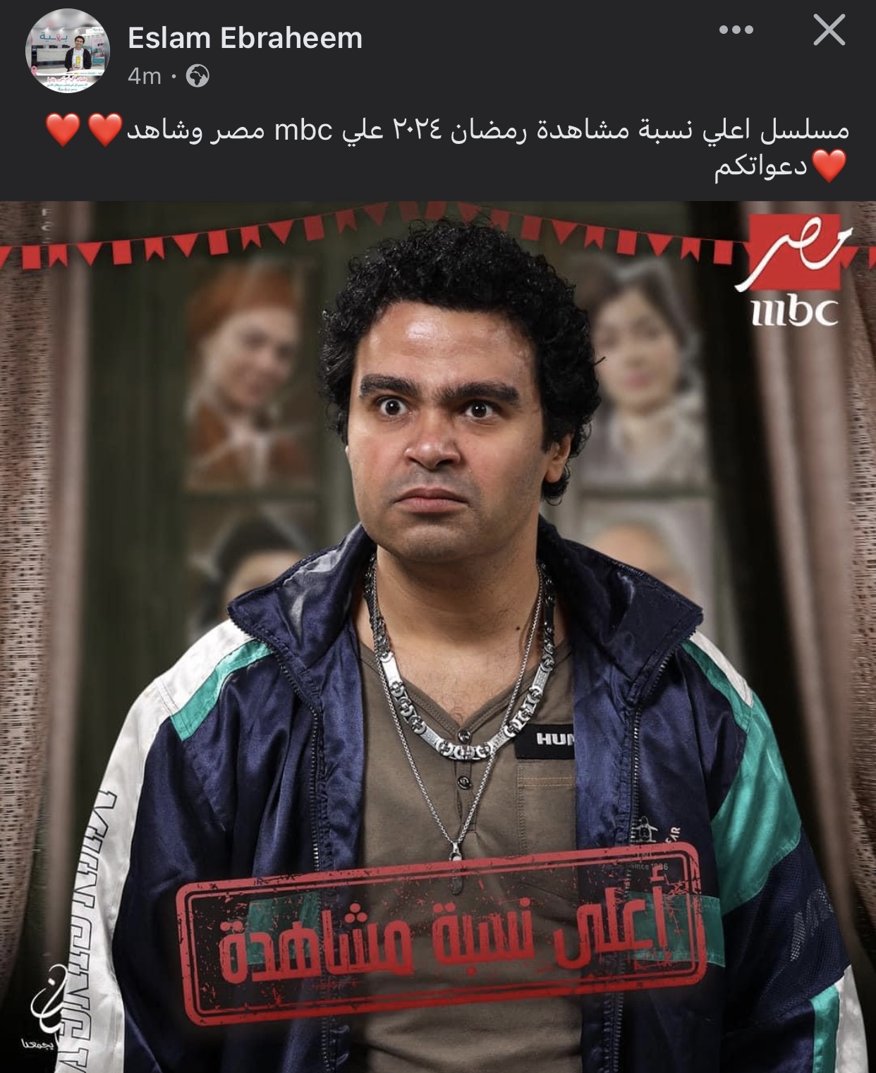 ونشر إسلام إبراهيم، البوستر الخاص بشخصيته في مسلسل أعلى نسبة مشاهدة، عبر حسابه بموقع التواصل الاجتماعي "فيسبوك"، معلقًا عليه قائلًا:" مسلسل أعلى نسبة مشاهدة رمضان 2024 على mbc مصر وشاهد، دعواتكم ".