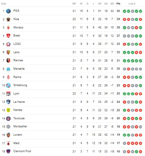 ورفع ليون رصيده إلى 25 نقطة في المركز الحادي عشر بترتيب جدول مسابقة الدوري الفرنسي، فيما توقف رصيد نيس عند 39 نقطة في المركز الثاني بجدول الترتيب.