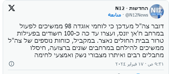 ونقلت القناة الــ12 الإسرائيلية، عن متحدث باسم جيش الاحتلال، قوله إن عناصر الفرقة 98 يواصلون عملهم في منطقة خان يونس.