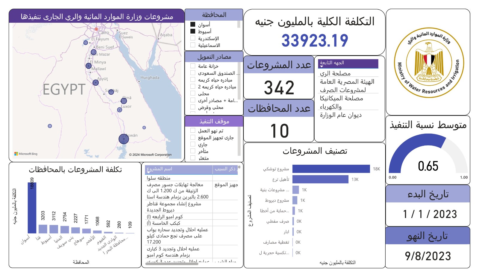 هذا ويتم متابعة معدلات التنفيذ للمشروعات بمختلف أجهزة الوزارة من خلال منظومة دعم قرار تفاعلية تتيح لمتخذ القرار استعراض جميع المؤشرات الخاصة بالمشروعات والمتمثلة في (جهة التنفيذ – مواقع المشروعات – متابعة تواريخ النهو المقررة – موقف التنفيذ - ..... إلخ) ، بالإضافة لتصنيف المشروعات من حيث (جهة التمويل ونوعه – طبيعة المشروعات – العائد والجدوى منها ..... إلخ) ومتوسط نسب التنفيذ والتكلفة بكل محافظة .
