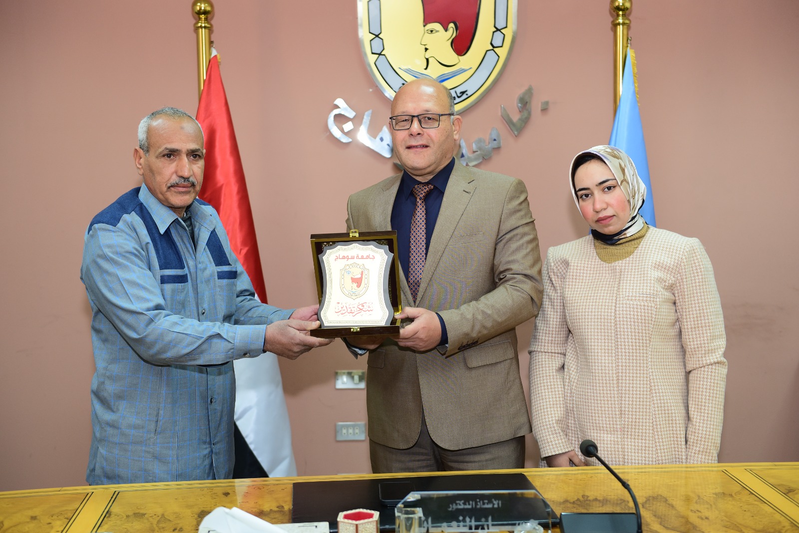 كرَّم الدكتور حسان النعماني، رئيس جامعة سوهاج، صباح اليوم الأربعاء، "عم عمر" الموظف بكلية الآداب بقسم الإعلام ونجلته أسماء، وذلك عقب تعيينها معيدة بقسم الإعلام بالجامعة، تقديرًا لتفوقها، وذلك بحضور الدكتورمحمد توفيق، عميد الكلية، بمقر مكتب رئيس الجامعة بالحرم القديم.