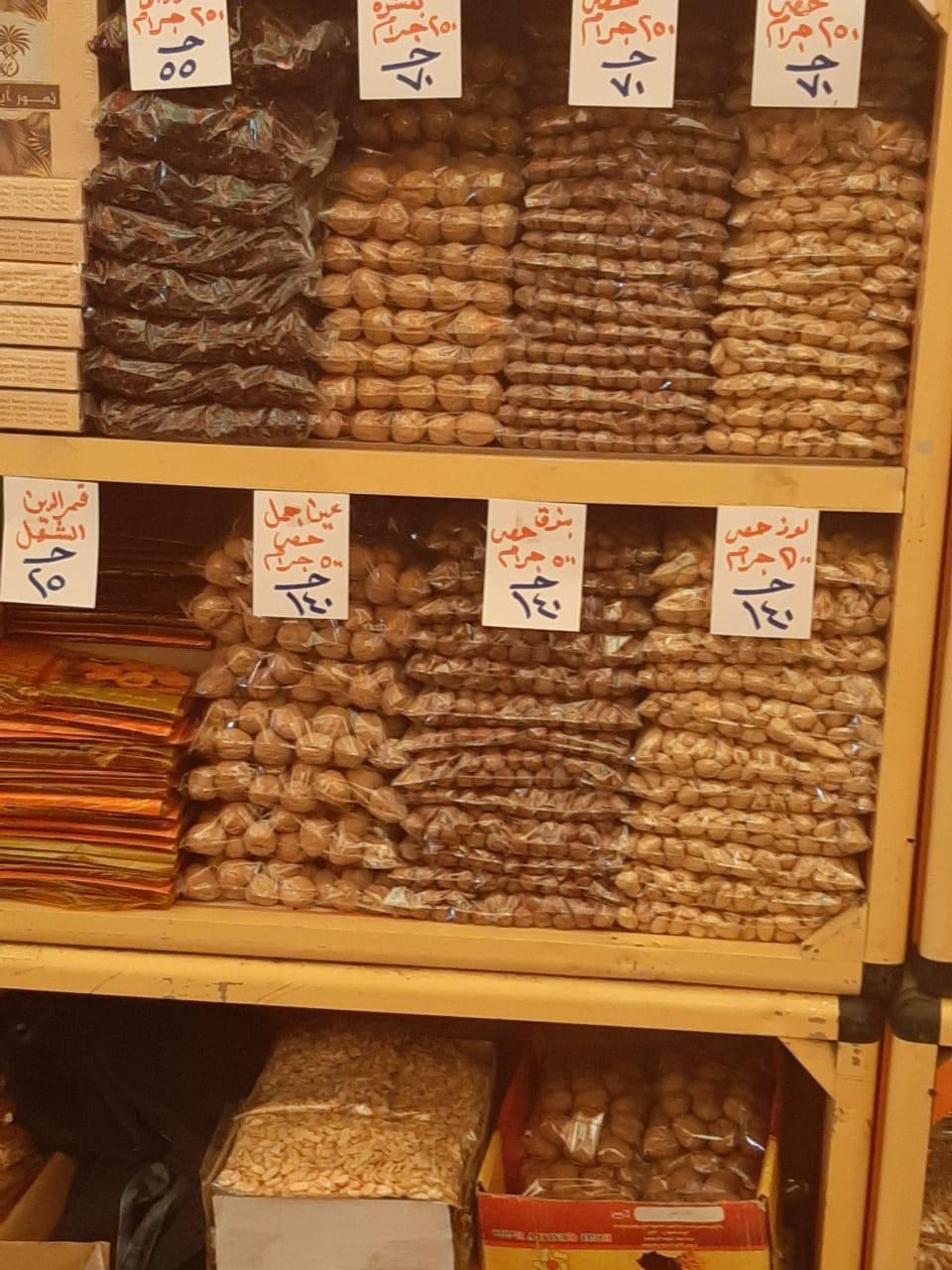 كركديه زنة 250 جرام بسعر 55 جنيها، سوداني جامبو زنة 250 جرام بسعر 40 جنيه، قراصيا مجففة زنة 500 جرام 140 جنيهًا، مشمشية زنة 500 جرام 180 جنيهًا، سوداني مقشر زنة 500 جرام 60 جنيهًا، زبيب بناتي فاتح زنة 150 جرام بسعر 80 جنيهًا.