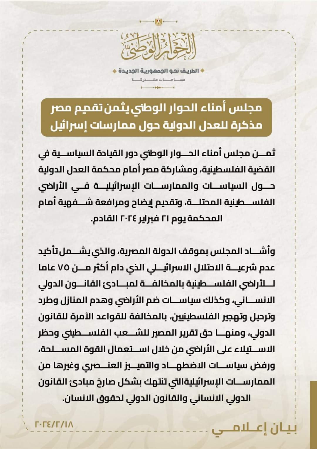 ثمّن مجلس أمناء الحوار الوطني دور القيادة السياسية في القضية الفلسطينية، ومشاركة مصر أمام محكمة العدل الدولية حول السياسات والممارسات الإسرائيلية في الأراضي الفلسطينية المحتلة، وتقديم إيضاح ومرافعة شفهية أمام المحكمة يوم 21 فبراير 2024 القادم.
