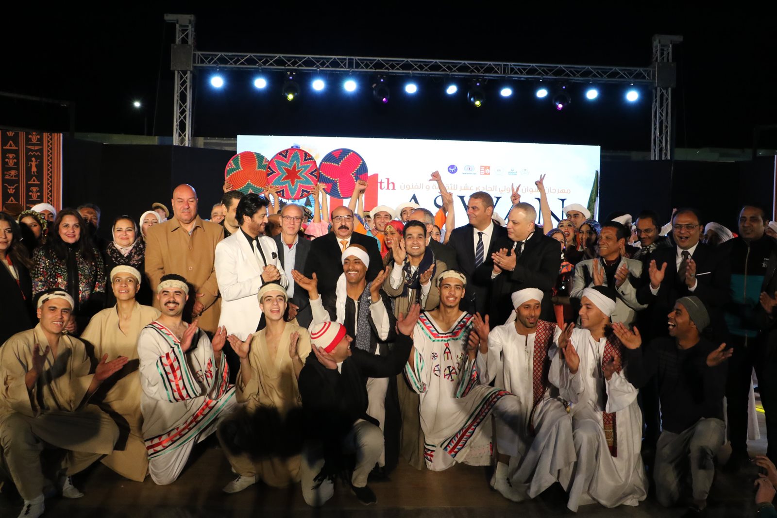 ألقى اللواء أشرف عطية، محافظ أسوان، كلمة رحب فيها بضيوف الحفل، وعبر عن سعادته بوجوده في أول مهرجان يقام على مسرح فوزي فوزي بعد تجديده، ثم قدم الشكر إلى الدكتورة نيفين الكيلاني، وزيرة الثقافة، ولرئيس الهيئة العامة لقصور الثقافة، ولجنة الإعلام والثقافة والآثار بمجلس النواب، والفرق المشاركة، وأعلن بدء فعاليات الدورة الحادية عشرة للمهرجان الذي يعد مناسبة هامة تساهم في الترويج والتسويق السياحي لأسوان، وطالب الحضور بالاستمتاع بجمال عاصمة الشباب والاقتصاد والثقافة الإفريقية، وفنونها المتميزة وقضاء أوقات سعيدة على أرضها الساحرة ذات الطبيعة الخلابة ونيلها الخالد وسط المعالم الأثرية والسياحية الشهيرة.