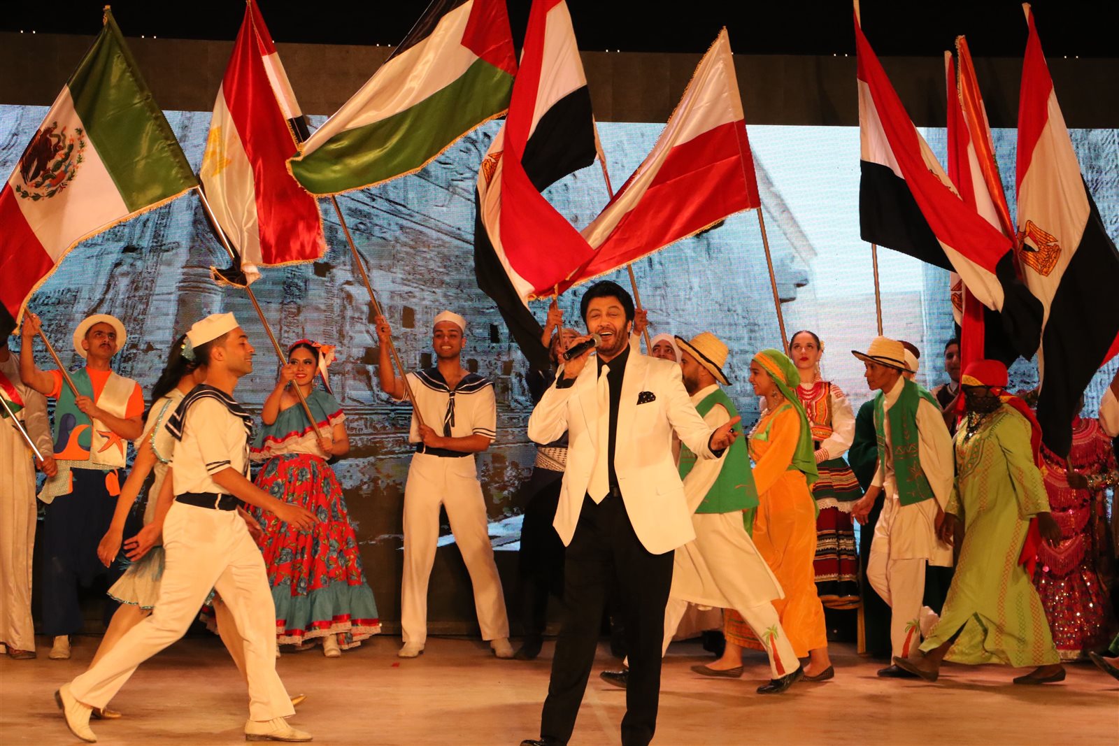 وبأزياء مميزة وفقرات استعراضية لاقت تفاعلا كبيرا من الجمهور، قدمت الفرق المشاركة فنونها الاستعراضية المعبرة عن ثقافتها وبيئاتها الثرية بالموروث الشعبي، ثم قدموا مزيجا فنيا فلكلوريا اختتم بأوبريت فني بعنوان "شعوب ترقص للشمس"، مع الفنان سامح يسري، وأخرج حفل الافتتاح الفنان ماهر كمال.