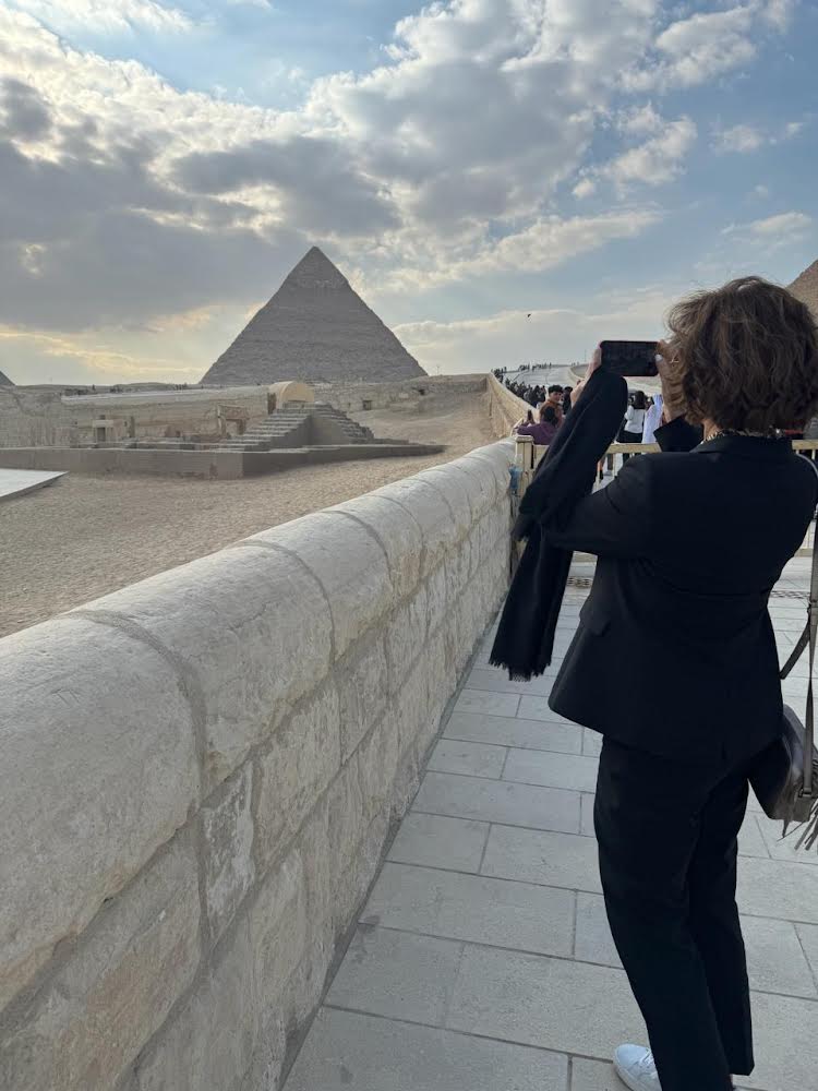 وكان في استقبالها  أشرف محيي الدين مدير عام منطقة آثار الهرم، والذي اصطحبهم في جولة بالمنطقة بدأت بزيارة للهرم الأكبر، العجيبة الوحيدة الباقية من عجائب الدنيا للعالم القديم، ومنطقة تمثال أبو الهول والبانوراما، حيث استمعت لشرح مفصل عن تاريخ المنطقة ككل وما بها من أهرامات ومقابر، وكيفية بناء هرم خوفو ونحت تمثال أبو الهول ومشروعات الترميم التي تتم بالمنطقة.