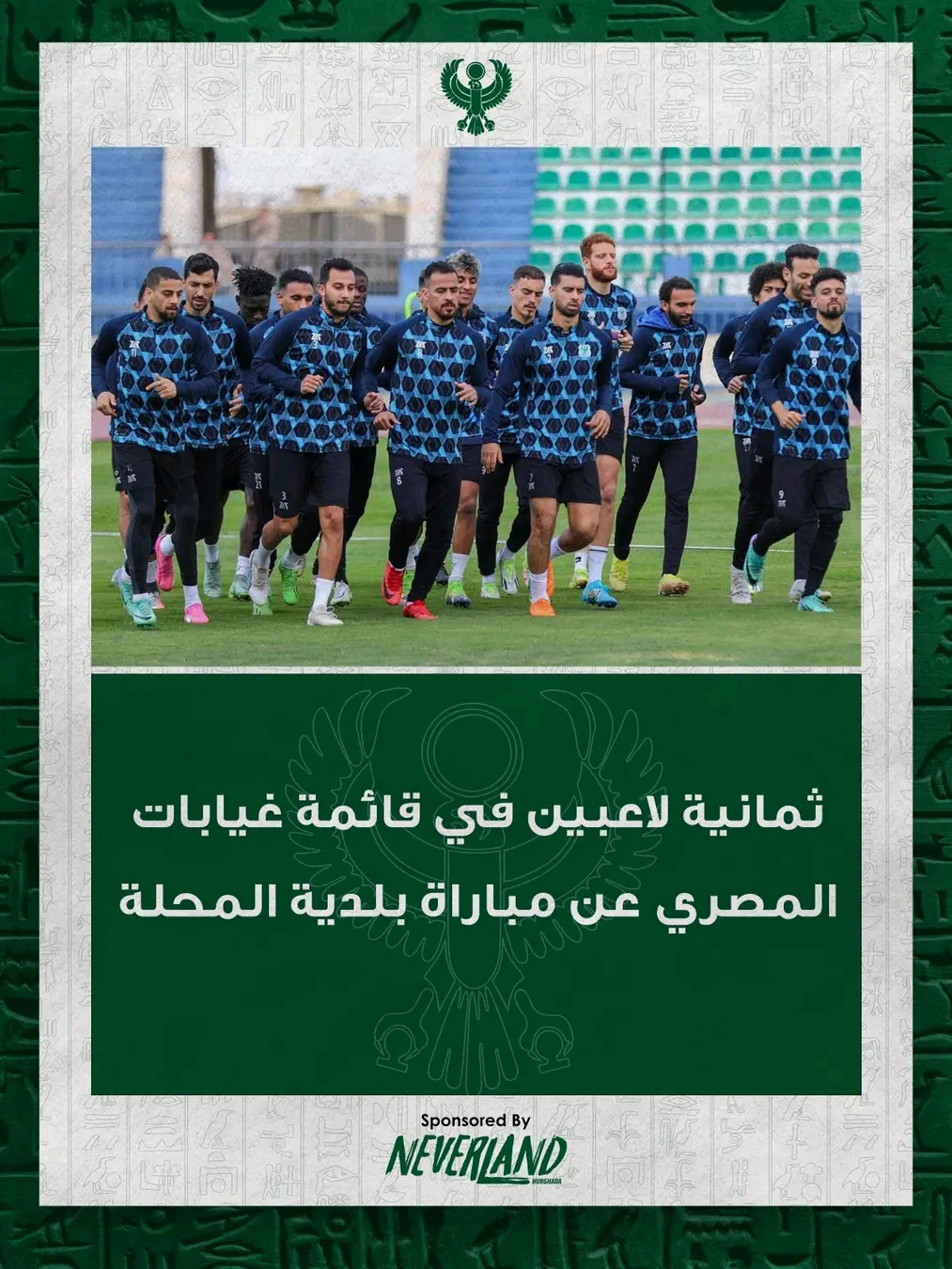 تأكد غياب ثمانية لاعبين عن مباراة الفريق الأول للكرة بالنادي المصري بالجولة الثالثة عشر من الدوري والتي تجمعه بنظيره فريق بلدية المحلة.