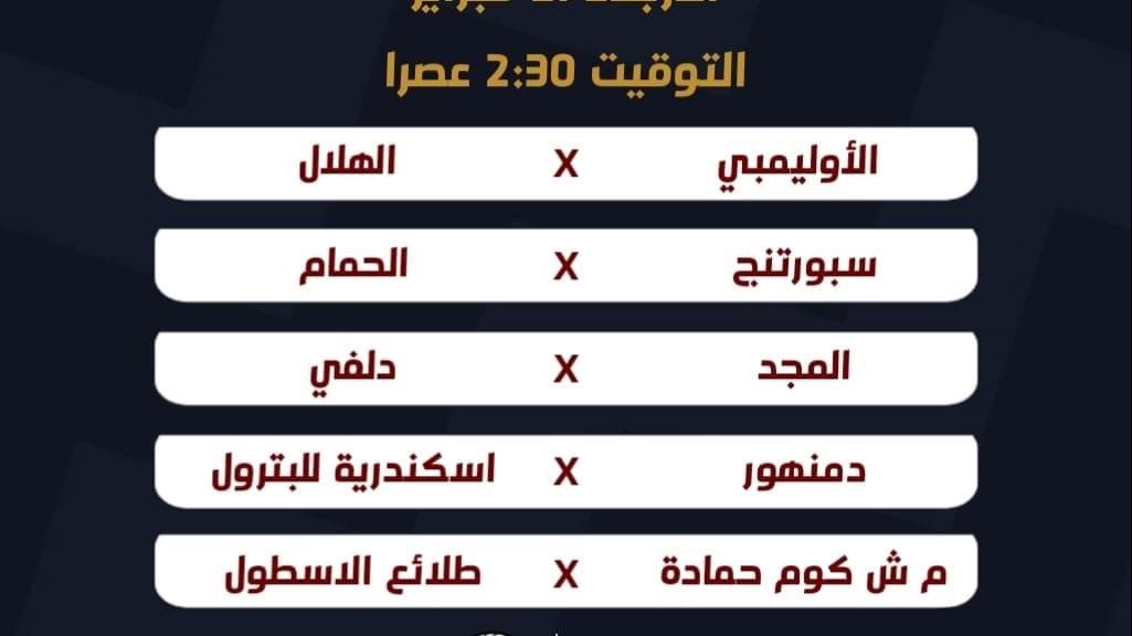 الاوليمبى والهلال/ سبورتنج والحمام / المجد ودلفى/ دمنهور واسكندرية للبترول / م ش كوم حمادة وطلائع الاسطول