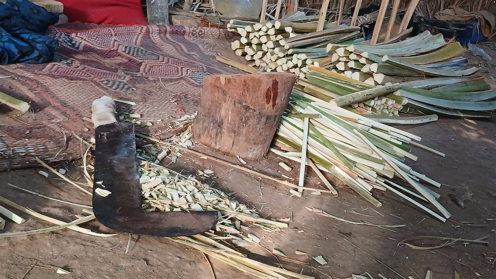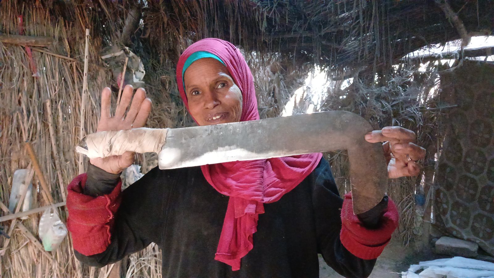 رغم ما يبدو في ملامح وجهها من الطيبة واللين، إلا أنها تحكم قبضة "المحشة" بسهولة كما الرجال، وهي أداة تشبه في هيئتها الساطور، لكنها أثقل في الوزن، تمسك ظريفة، ذات الستة عقود "المحشة" وتبدأ في بتر الأجزاء الزائدة من جريد النخيل، والذي جهزته مسبقًا إلى أجزاء صغيرة؛ لاستخدامه في صناعة الأقفاص.