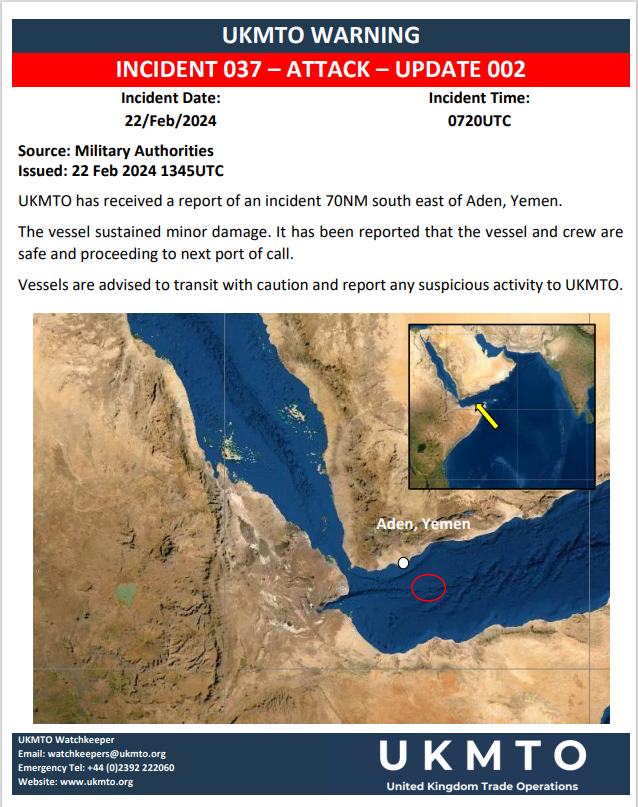 كشفت هيئة عمليات التجارة البحرية البريطانية، عن تعرض سفينة لهجوم على بعد 70 ميلًا بحريًا جنوب شرقي عدن اليمنية.