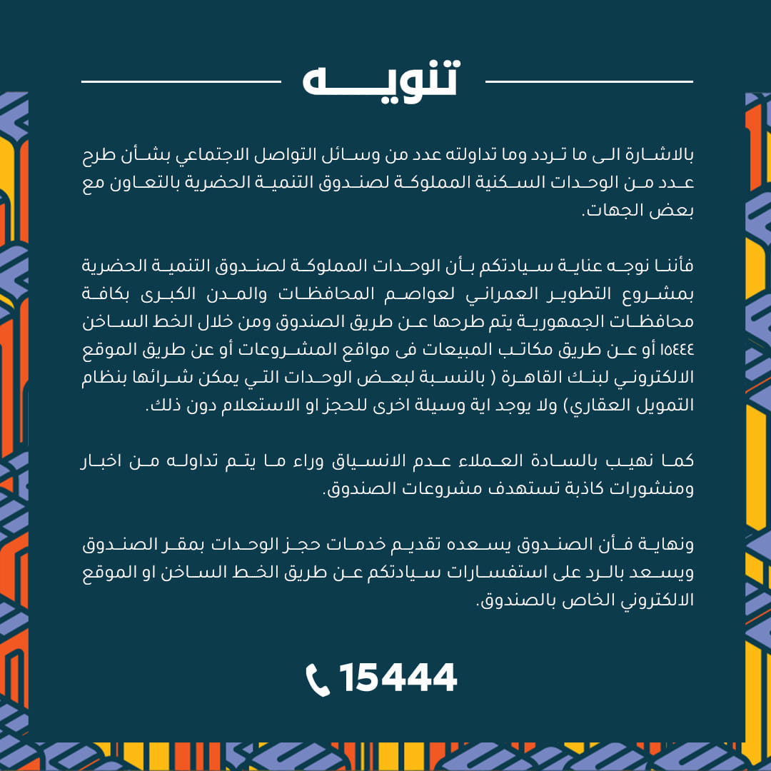 وذكر الصندوق، في بيانه، أن الوحدات المملوكة لصندوق التنمية الحضرية بمشروع التطوير العمراني لعواصم المحافظات والمدن الكبرى بكافة محافظات الجمهورية يتم طرحها عن طريق الصندوق، ومن خلال الخط الساخن ١٥٤٤٤ أو عن طريق مكاتب المبيعات في مواقع المشروعات أو عن طريق الموقع الإلكتروني لبنك القاهرة )، بالنسبة لبعض الوحدات التي يمكن شرائها بنظام التمويل العقاري ولا يوجد أية وسيلة أخرى للحجز أو الاستعلام دون ذلك.