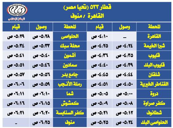أعلنت الهيئة القومية لسكك حديد مصر اعتباراً من يوم السبت الموافق 24 / 2 / 2024 يتم تشغيل قطار 533 ( خدمة جديدة ) بعربات تحيا مصر ما بين القاهرة / منوف حيث يقوم من القاهرة الساعة 4:10 صباحاً ويصل منوف الساعة 6:25 صباحاً طبقاً للجدول المرفق .