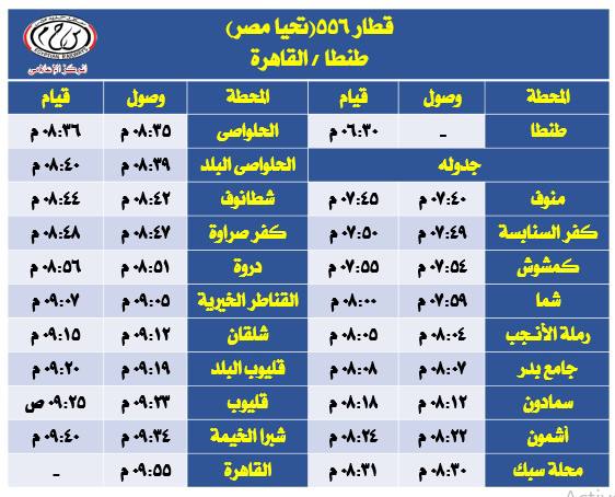 كما قررت الهيئة اعتباراً من يوم الجمعة الموافق 23 / 2 / 2024 امتداد مسير قطار 556 ركاب طنطا / منوف لمحطة القاهرة حيث يقوم من طنطا الساعة 6:30 مساءاً ويصل القاهرة الساعة 9:55 مساءاً طبقا للجدول المرفق .