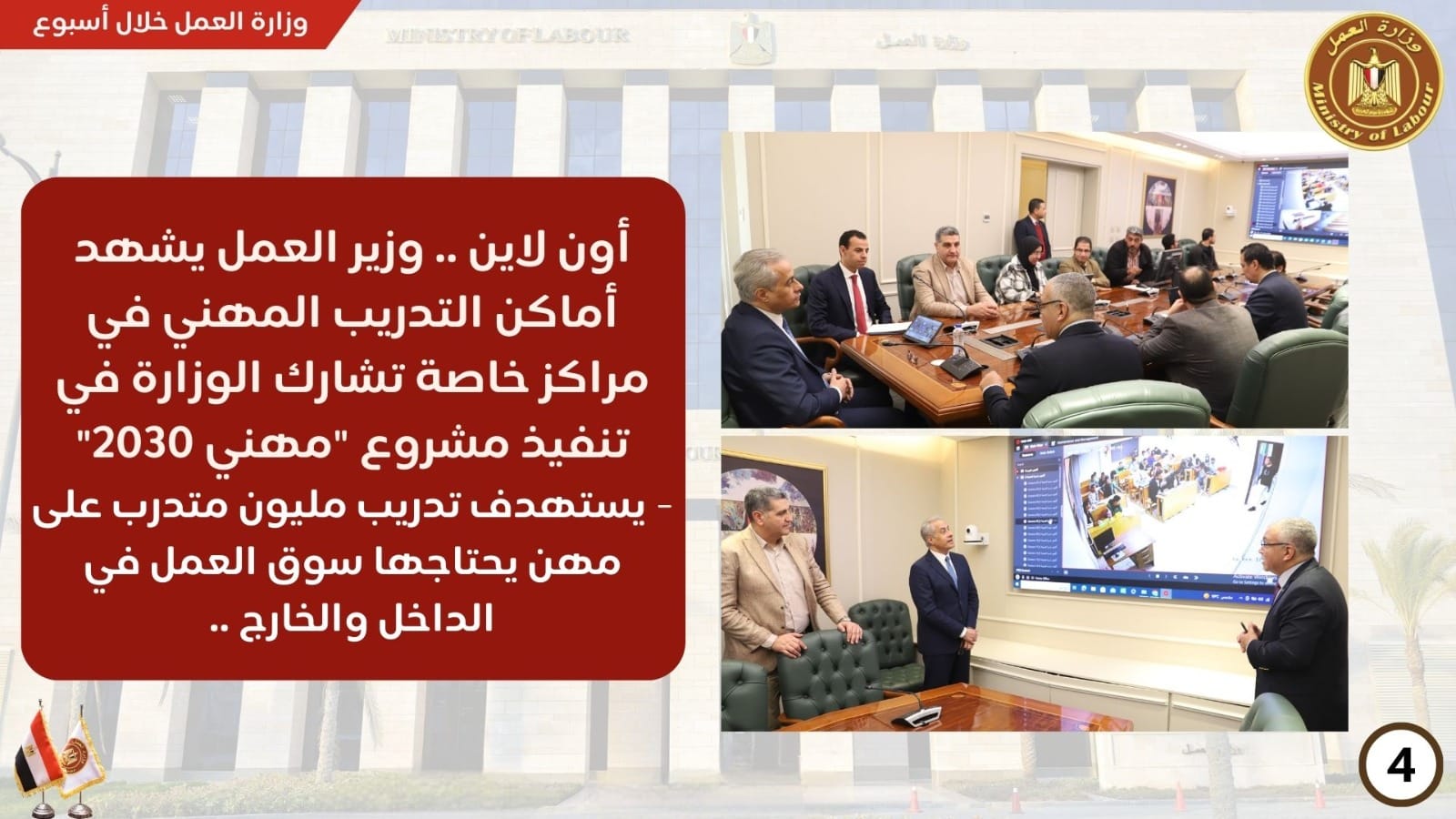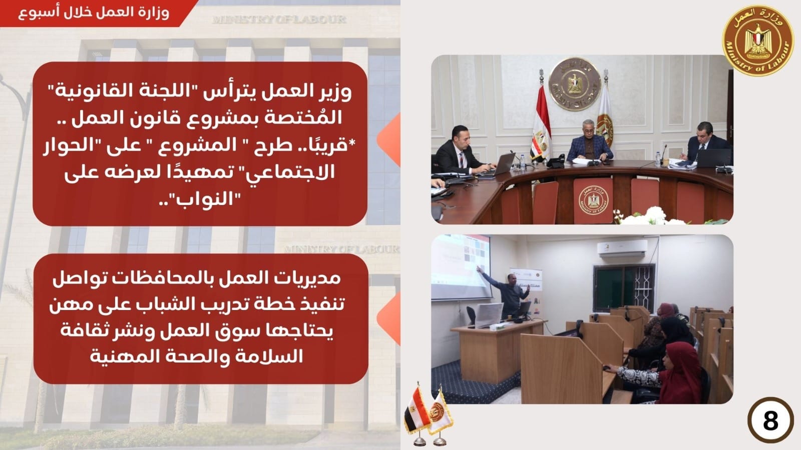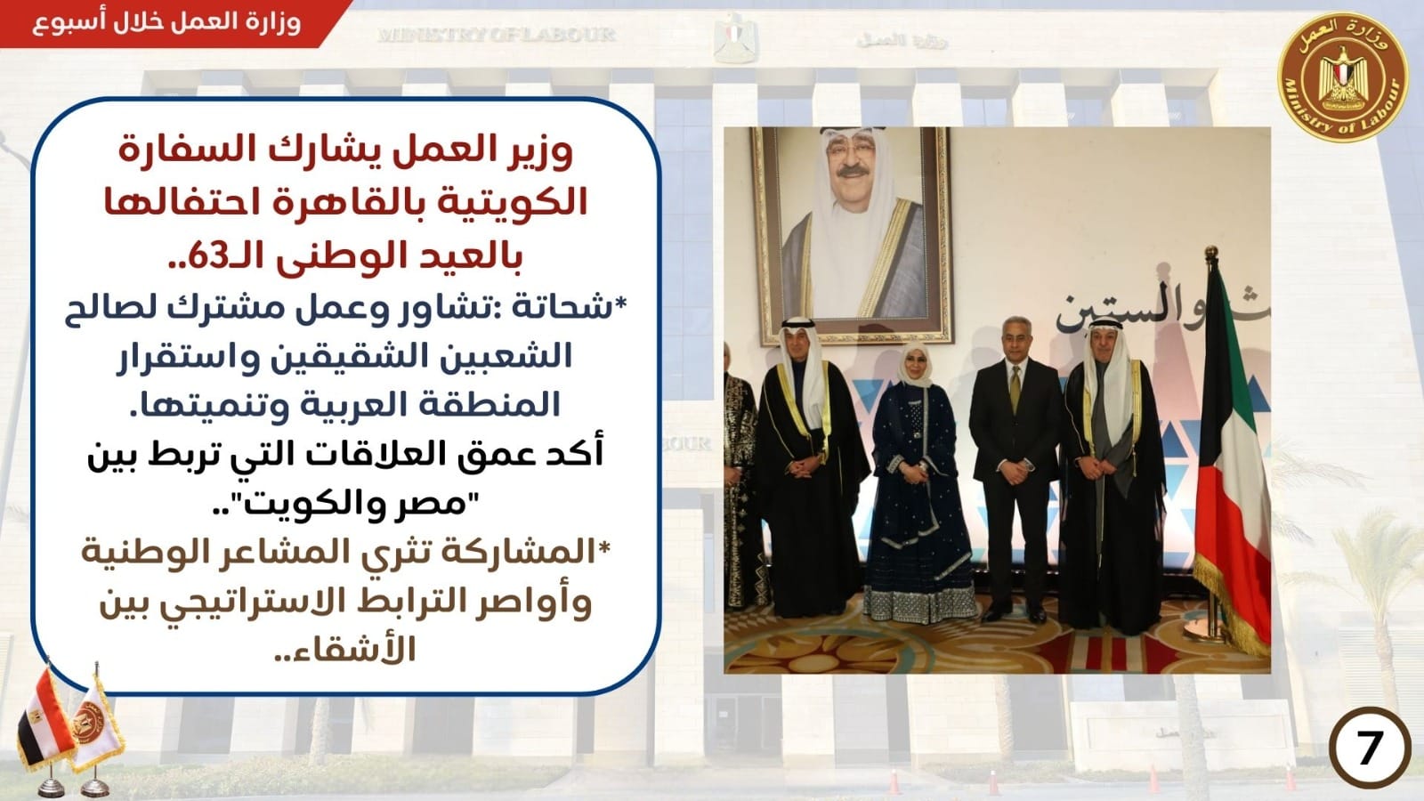 وتابع الوزير عرض الموقف الحالي لإجراءات تنفيذ خطة "الوزارة" نحو رقمنة الخدمات المُقدمة للمواطنين، تمهيدًا لبدء إجراءات الاطلاق على بوابة " مصر الرقمية "..كما شارك ، السفارة الكويتية بالقاهرة،ومندوبية الكويت الدائمة لدى جامعة الدول العربية، حفل استقبال بمناسبة العيد الوطني للكويت الثالث والستين، والذي نظمته السفارة الكويتية.. وواصلت "اللجنة القانونية"برئاسة وزير العمل،والمُختصة بدراسة وصياغة الملاحظات الواردة من ممثلي أصحاب الأعمال والعمال على مشروع قانون العمل ..كما وجه الوزير ،في إجتماع بالعاصمة الإدارية ،كافة الادارت المُختصة بالعمالة غير المنتظمة والتحول الرقمي بتكثيف الجهود خلال الفترة المُقبلة..وإستمرت مديريات العمل بالمحافظات فى تنفيذ خطة الوزارة بشأن تدريب الشباب على مهن يحتاجها سوق العمل،وتوفير فرص العمل تنسيقا مع القطاع الخاص ، ونشر ثقافة السلامة والصحة المهنية،والتفتيش على المنشأت لتعزيز علاقات العمل بين صاحب العمل والعامل،وتطبيق القوانين ..إلى التفاصيل ..