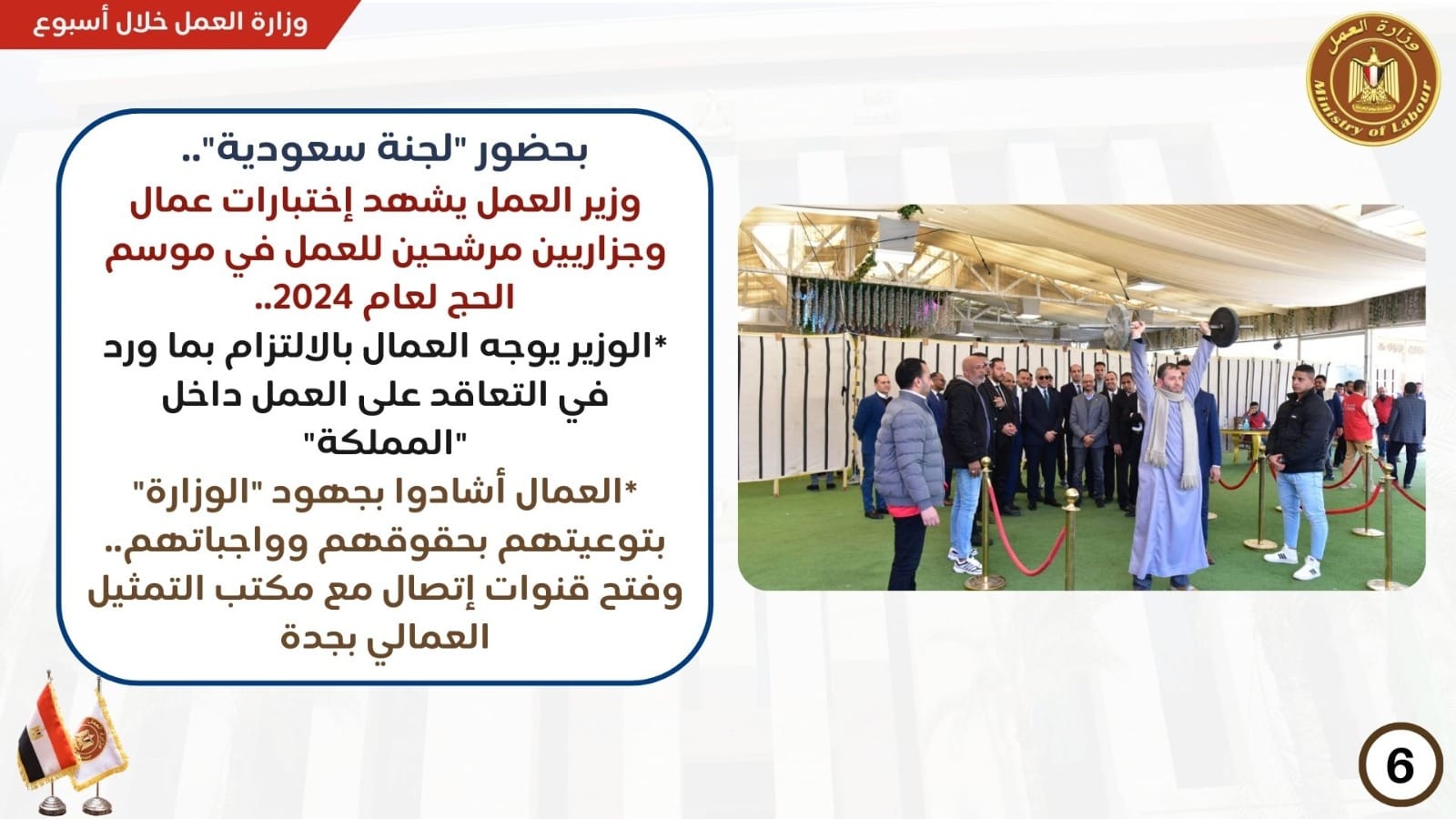 وشهد حسن شحاتة وزير العمل ،إختبارات عمال وجزاريين من المرشحين للعمل خلال موسم الحج للعام الهجري 1445،والميلادي 2024،وذلك بقاعة جرين بلازا بمنطقة المريوطية بمحافظة الجيزة ،والتي تنظمها " لجنة سعودية" ،تتكون من :إبراهيم المسيع، والنقيب إبراهيم الصالح ممثلي وزارة الداخلية السعودية، وأحمد اليحي ممثل وزارة المالية السعودية، ويعقوب اللهيبي ممثل وزارة الموارد البشرية والتنمية الاجتماعية السعودية، وسراج فلالي، ومحمد الروابدة وماجد العتيبي، وهتان بغدادي، وعقيل الزبيدي، وعبد الرحمن الزهراني، و مصطفى التركي، وخالد الطويرقي، وسعيد هوساوي عبد الرحمن الشريف، و عبد الرحمن الطاسان من ممثلي الهيئة الملكية لمكة المكرمة، وأحمد العيسى ، وعبد الله الجبر ممثلي وزارة الخارجية السعودية،وذلك بحضور ممثلين عن شركات إلحاق عمالة مرخصة من وزارة العمل .. وشدد الوزير شحاتة على أهمية التزام شركات إلحاق العمالة بالخارج،و العِمالة، بكافة الشروط والإجراءات الرسمية..ووجه العمال الشكر والتقدير للوزارة على دورها في المتابعة وتذليل العقبات أمامهم خلال فترة التقديم بشركات إلحاق العمالة المُعتمدة من الإدارة العامة لشركات إلحاق العمالة التابعة للوزارة،ومراقبة، وانهاء كافة إجراءات التعاقد السفر،والاختبارات الحالية ،وإستمرار متابعتهم حتى داخل "المملكة" من خلال مكتب التمثيل العمالي ،كما أشادوا بـ"وحدة توجيه ما قبل المُغادرة" ،ودورها في توعيتهم بحقوقهم وواجباتهم خلال فترة العمل في السعودية..