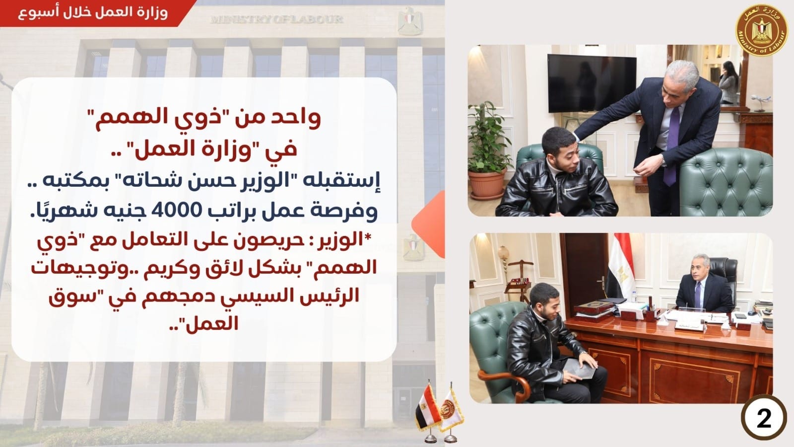 وإستقبل حسن شحاتة وزير العمل ،بمكتبه بديوان عام "الوزارة" ،المواطن أحمد عمر جاد الكريم،من ذوي الإحتياجات الخاصة "إعاقة بصرية"،برفقته والده،وسَلّمهُ عقد عمل بشركة سيتي ستارز للإدارة والاستشارات العقارية براتب 4000 جنيه شهريًا ..وبحسب بيان صحفي ،دار حوار بين "الوزير" والشاب أحمد من أبناء محافظة القاهرة ،والبالغ من العمر 24 عامًا ،و طَمْأَنَه بأن "الجمهورية الجديدة" حريصة على التعامل مع كافة المواطنين بشكل لائق وكريم ،وخاصة "ذوي الهمم" ،وأن السيد الرئيس عبدالفتاح السيسي رئيس الجمهورية يتابع هذا الملف بنفسه ،ويوجه بدمجهم في سوق العمل.. ووجه الشاب أحمد الشكر والتقدير لوزير العمل على هذا الإستقبال ،وسرعة التوجيه بتوفير فرصة عمل ،مؤكدًا على إعتزازه بإنتمائه للجمهورية الجديده بقيادة الرئيس السيسي،التي تهتم بذوي الهمم،وتعهد بالعمل الجاد للمزيد من الإرتقاء والتقدم لمصر..حضر اللقاء والد الشاب أحمد عمر، واللواء محسن الحلفاوي مدير العلاقات العامة والحكومية بالشركة، وهبه أحمد مدير عام التشغيل بالوزارة..جدير بالذكر أنه وبمتابعة مباشرة، ويوميه من وزير العمل حسن شحاتة، تواصل "الوزارة "ومديرياتها،تنفيذ خطة "الحصر والتدريب والتشغيل " لذوي الهمم ..تلك الخطة التي بدأت مطلع العام 2023 الماضي ،تزامنًا مع توجيهات الرئيس السيسي،لوزارة العمل ،بدمج ذوي الهمم في سوق العمل ...وبالأرقام تمكنت الوزارة ومديرياتها، من توفير فرص عمل بلغ عددها 2246 فرصة لذوي همم في منشأت قطاع خاص ،وذلك خلال الـ3 أشهر الماضية، وبالتحديد في الفترة من 1-10-2023 وحتى 31-1- 2024..ومنذ بداية عملية حصر المنشآت في الأول من يناير 2023 وحتى الآن، بلغ عدد المُعينين من ذوي الهمم 12455،كما أن المديريات ومكاتبها المُختصة تتواصل يوميًا مع المنشآت، وتستكمل عملية باقي الحصر والتدريب والتشغيل..وبشأن عمليات الحصر ،فخلال عام 2023، قامت الوزارة والمديريات، بحصر 16 ألفًا و 907 منشأة من إجمالى المنشآت التي يزيد عدد عمالها عن 20 عاملًا والتي تبلغ 24 ألفاً و69 منشأة، يعمل فيها 2 مليون و 659 ألفاً و 564 عاملاً، وذلك من واقع بيانات هيئة التأمينات الإجتماعية، وتبين أن عدد المطلوب تعيينه لاستيفاء نسبة ذوي الهمم في هذه المنشآت التي تم حصرها يبلغ 131 ألفاً و 629 عاملاً، و المُعين منهم فقط 73 ألفاً و 594 عاملاً، و المتبقي استيفائه للتعيين يبلغ 49 ألفًا و 59 عاملًا.