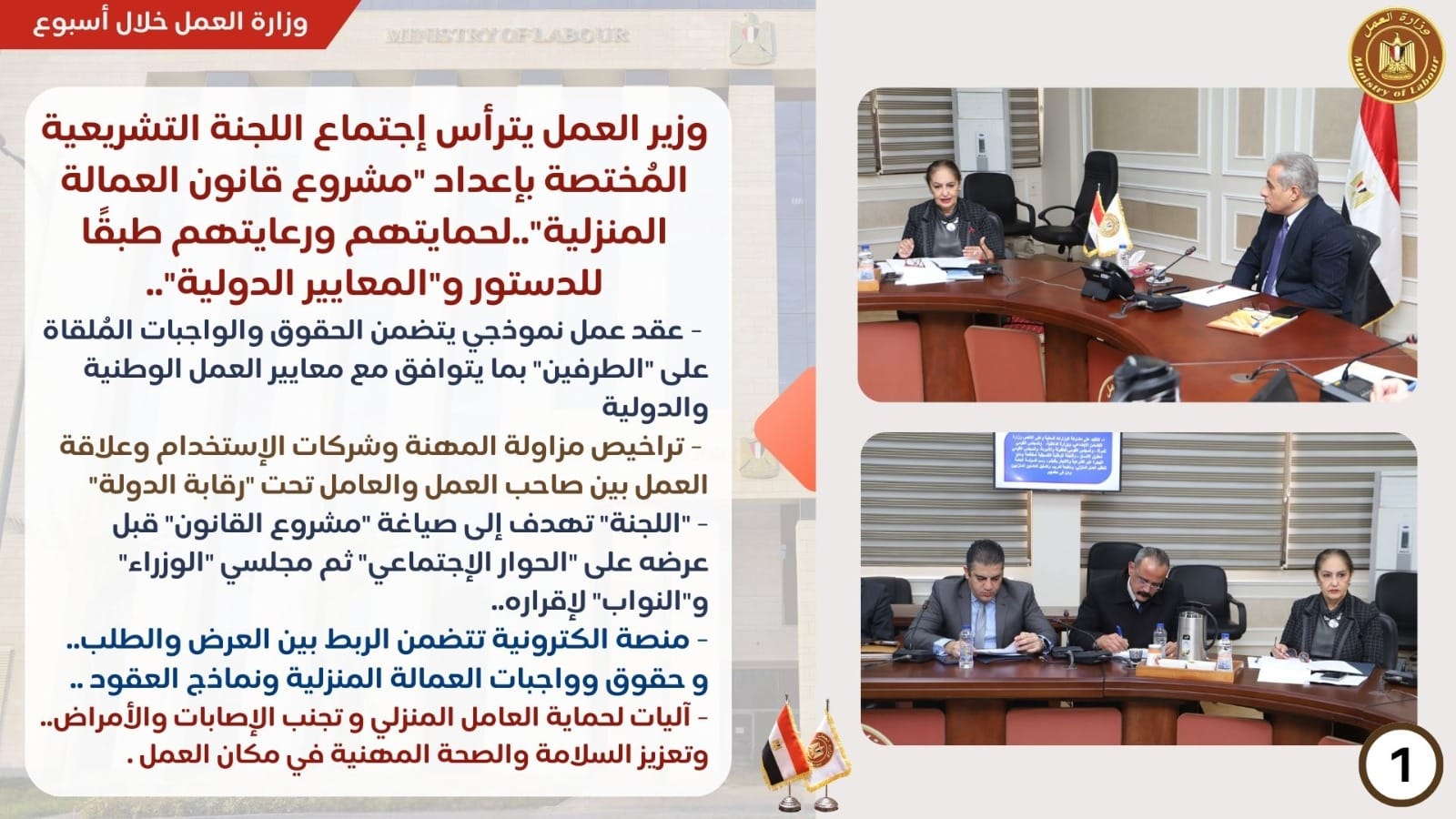 ترأس حسن شحاتة وزير العمل ، بديوان عام "الوزارة" ،إجتماعًا للجنة التشريعية المُختصة بإعداد "مشروع قانون العمالة المنزلية"، ومن في حُكمهم،بحضور مُمثلين عن وزارات العدل ،والتضامن الإجتماعي،والتخطيط والتنمية الإقتصادية،والتعاون الدولي ،والمجالس "القومي لحقوق الإنسان،والقومي للمرأة،والقومي للطفولة والأمومة"،واللجنة التنسيقية لمكافحة ومنع الهجرة غير الشرعية والإتجار في البشر،والمستشار القانوني لوزير العمل "مُقررًا للجنة"،حيث تختص "اللجنة" بإعداد ودراسة مشروع قانون العمالة المنزلية ومن في حُكمهم ،بما يتوافق مع الدستور المصري،ومعايير العمل الوطنية و الدولية ،وحقوق الإنسان..وبحسب بيان صحفي قال وزير العمل حسن شحاتة أن القانون يهدف إلى تقديم الحماية والرعاية لهذه الفئة،وتقنين أوضاعها، ودمجها في سوق العمل الرسمي،وتدريبها وتأهيلها،ومنحها شهادات مُزاولة مهنة ،والتعامل القانوني مع شركات الإستخدام ،وأصحاب الأعمال،بعقود عمل رسمية ،وتراخيص قانونية،واستمع الوزير شحاتة إلى رؤية واستفسارات ممثلي الوزارات والجهات المعنية..وجاء في البيان أن إيهاب عبدالعاطي المستشار القانوني لوزير العمل، طرح على المشاركين في الاجتماع مُسودة أَوّلية ،ومقترحات للمشروع لمُناقِشتها من جانب أعضاء "اللجنة"،والتوصل إلى صياغة نهائية ،ثم طرحها بعد ذلك على المجلس الأعلى للحوار الإجتماعي،ثم على مجلسي "الوزراء" و"النواب "،تمهيدًا لإصدار القانون وتطبيقه..