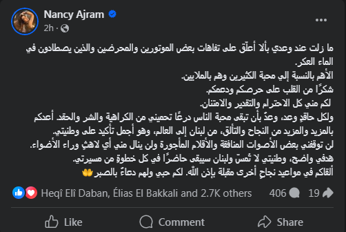 وأضافت نانسي عجرم :"لن توقفني بعض الأصوات المنافقة والأقلام المأجورة ولن ينال مني أي لاهثٍ وراء الأضواء.. هدفي واضح، وطنيتي لا تُمسّ ولبنان سيبقى حاضرًا في كل خطوةٍ من مسيرتي.. ألقاكم في مواعيد نجاحٍ أخرى مقبلة بإذن الله.. لكم حبي ولهم دعاءٌ بالصبر".