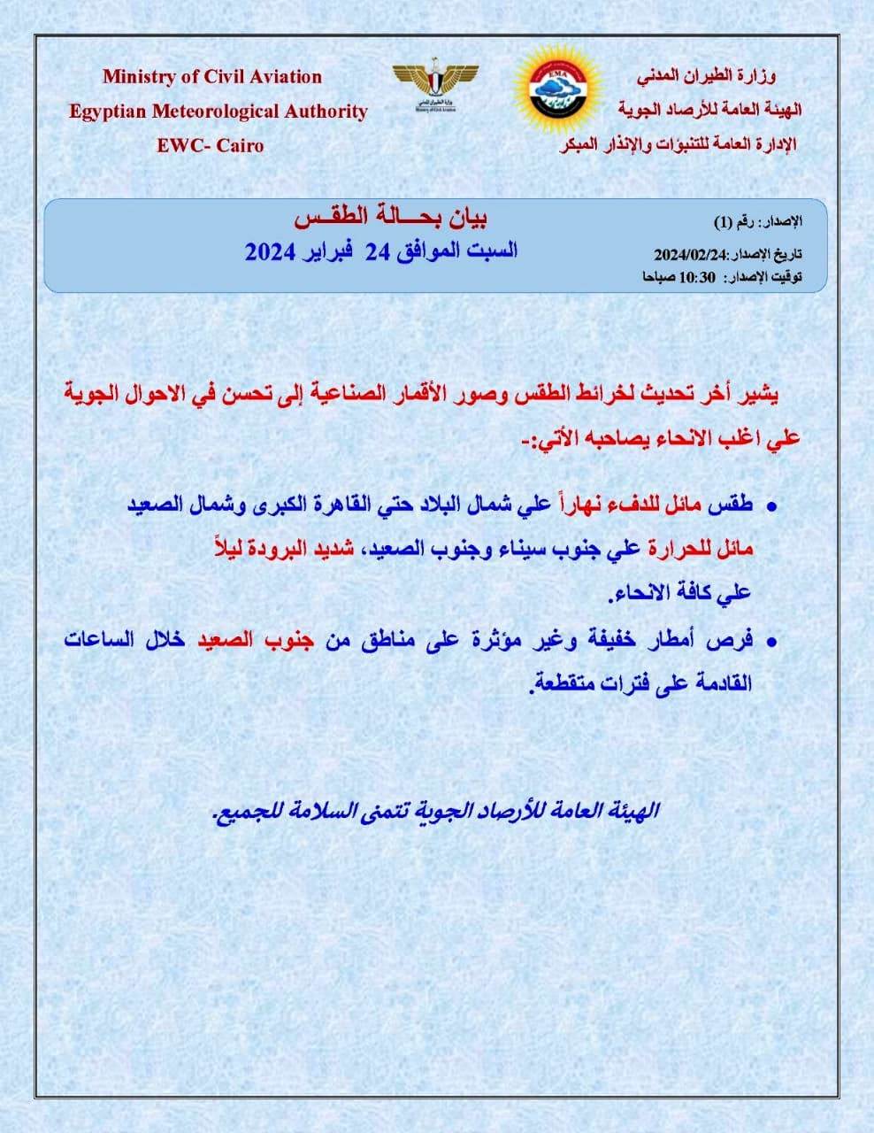 ولفت إلى أنه يتم تلقى أى شكاوى أو بلاغات على الخط الساخن 114، بجانب خطوط الواتس آب بأرقام  01149730943، و 01278655167  ، و 01091565955 ، أو عبر الخط الساخن لمجلس الوزراء 16528 ، وكانت قد أعلنت الهيئة العامة للأرصاد الجوية عن تحسن فى الأحوال الجوية على أغلب الأنحاء يصاحبه طقس مائل للدفء نهاراً على شمال البلاد حتى القاهرة الكبرى وشمال الصعيد ، ومائل للحرارة على جنوب سيناء وجنوب الصعيد ، وشديد البرودة ليلاً على كافة الأنحاء ، فضلاً عن فرص سقوط أمطار خفيفة وغير مؤثرة على مناطق من جنوب الصعيد خلال الساعات القادمة على فترات متقطعة .