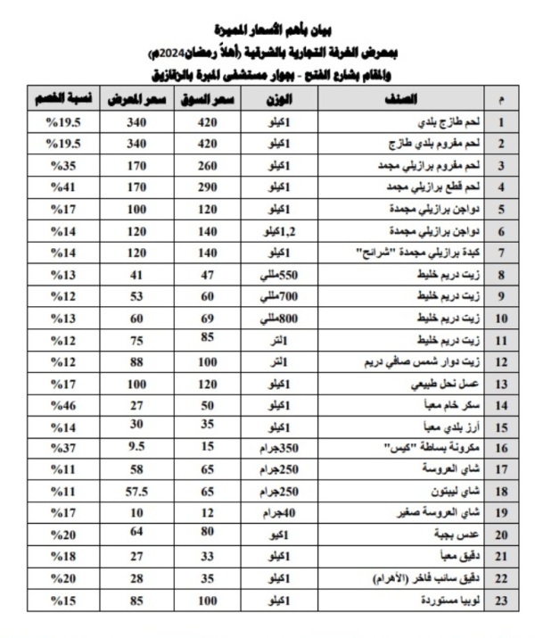يذكر أن الدكتور ممدوح غراب محافظ الشرقية، قد افتتح معرض "أهلاً رمضان" لبيع السلع الأساسية والمواد الغذائية بأسعار مخفضة للمواطنين، والذي تقيمه المحافظة بالتعاون مع الغرفة التجارية ومديرية التموين وذلك بجوار مسجد الفتح بمدينة الزقازيق.
