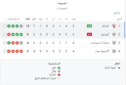 واستطاع الزمالك تصدر مجموعته في بطولة الكونفيدرالية الإفريقية، حيث جاء ترتيب المجموعة كالتالي: