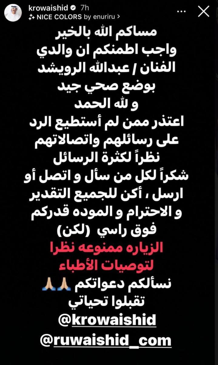 كتب خالد نجل “عبدالله الرويشد” رسالة عبر حسابه الشخصي بموقع التواصل الاجتماعى “إنستغرام”قائلاً:"واجب اطمئنكم أن والدي الفنان عبد الله الرويشد بوضع صحي جيد ولله الحمد،واعتذر عن عدم الرد على رسائلهم واتصالاتهم نظرًا لكثرة الرسائل.. شكرًا لكل من سأل أو اتصل أو أرسل.. أكن للجميع التقدير والاحترام والمودة" وأشار إلى أن الزيارات ممنوعة نظراً لتوصيات الأطباء.