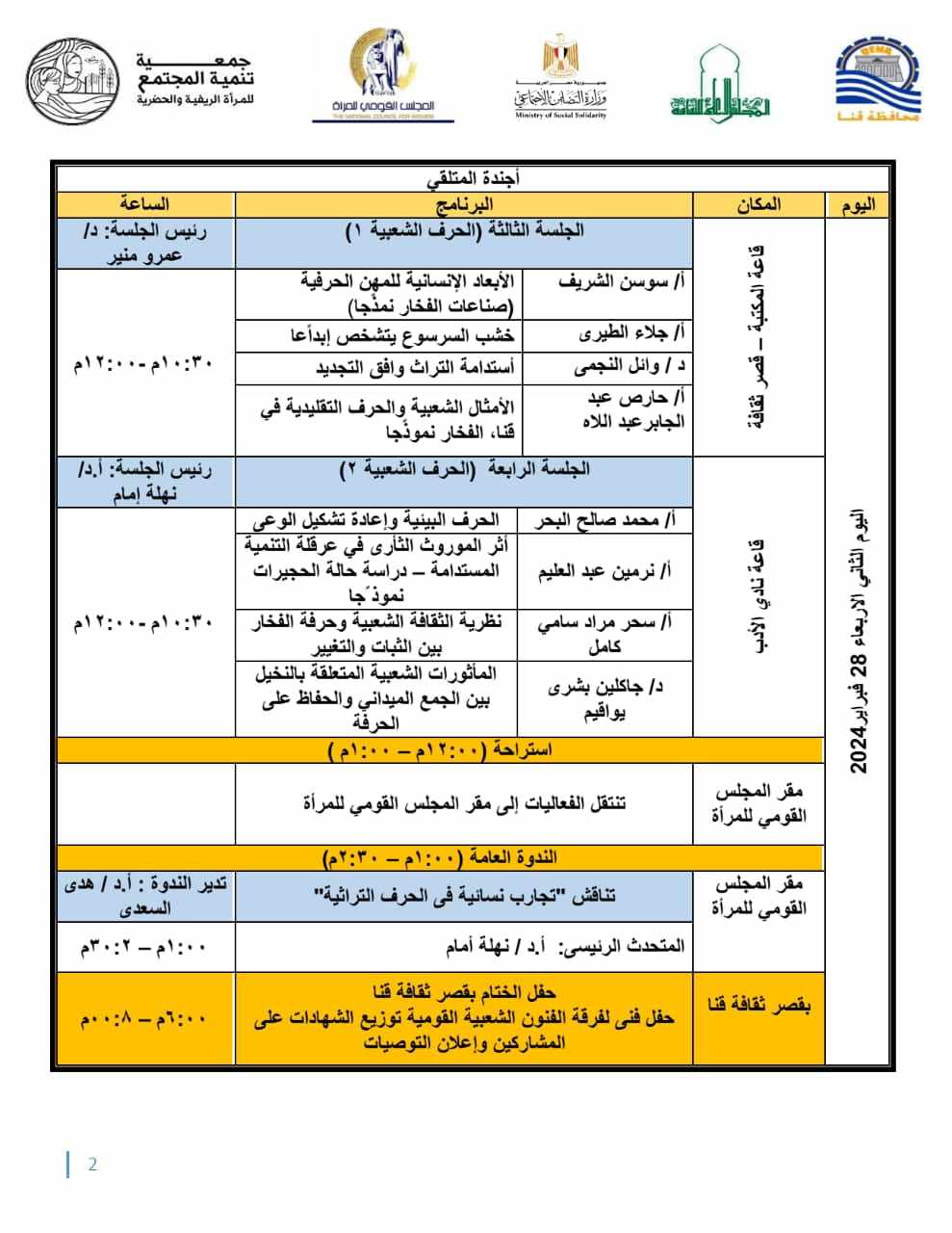 وتتضمن فعاليات اليوم الثانية عقد جلستين بقصر ثقافة قنا، ويرأس الجلسة الأولى الدكتور عمرو منير، وتناقش عدة أبحاث، الأول بعنوان " الأبعاد الانسانية للمهن الحرفية – صناعة الفخار نموذجًا لـ "سوسن الشريف".