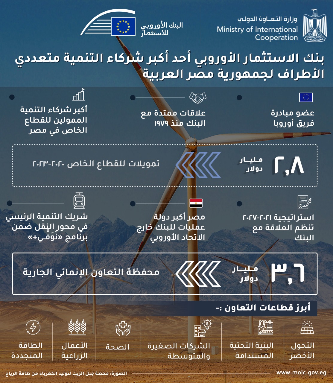 في هذا التقرير تستعرض وزارة التعاون الدولي، 25 معلومة حول العلاقات المشتركة بين جمهورية مصر العربية وبنك الاستثمار الأوروبي، في ضوء الدور الذي تقوم به الوزارة لتنمية وتدعيم العلاقات الاقتصادية مع شركاء التنمية متعددي الأطراف والثنائيين والمؤسسات الدولية، بما يعزز رؤية الدولة التنموية.