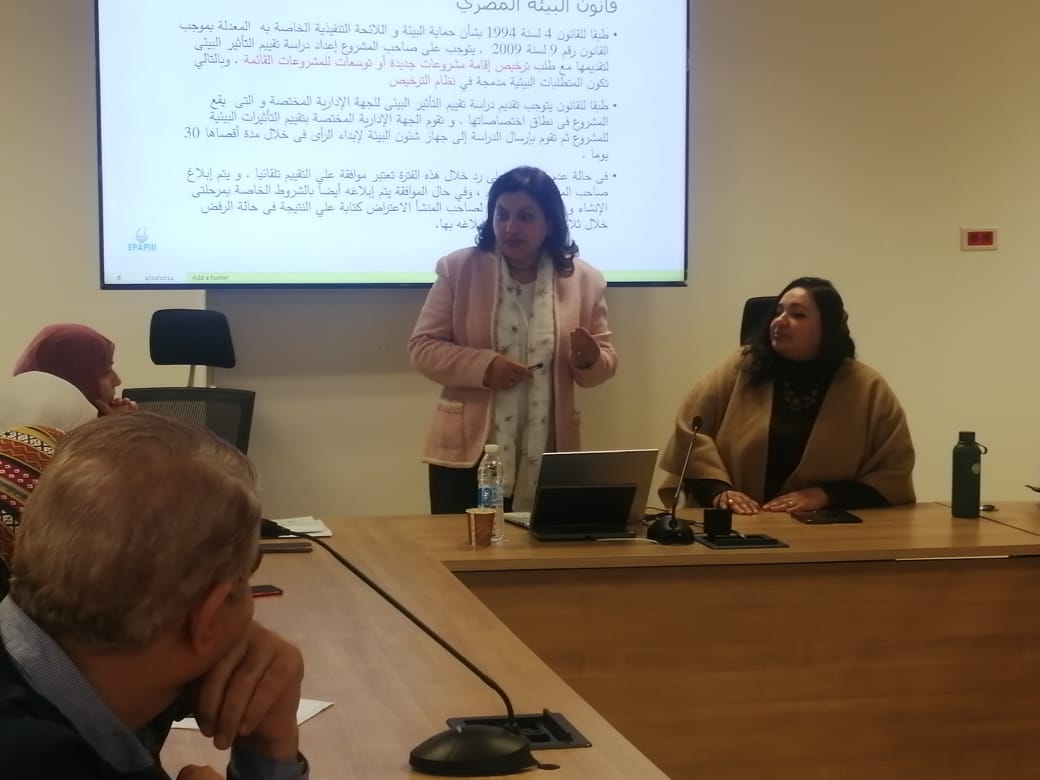 وقد تناول البرنامج التدريبى عرضًا لأهمية وأهداف دراسة تقييم التأثر البيئي، حيث أنها تعد أداة إدارة بيئية تدعم اتخاذ القرار لضمان التنمية المستدامة والمقبولة بيئيا، وكذلك أنواع ومستويات دراسات تقييم التأثير البيئي.