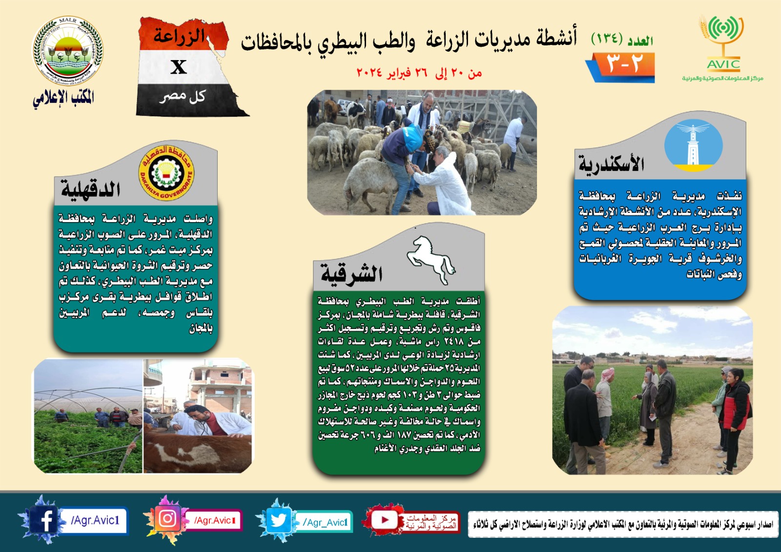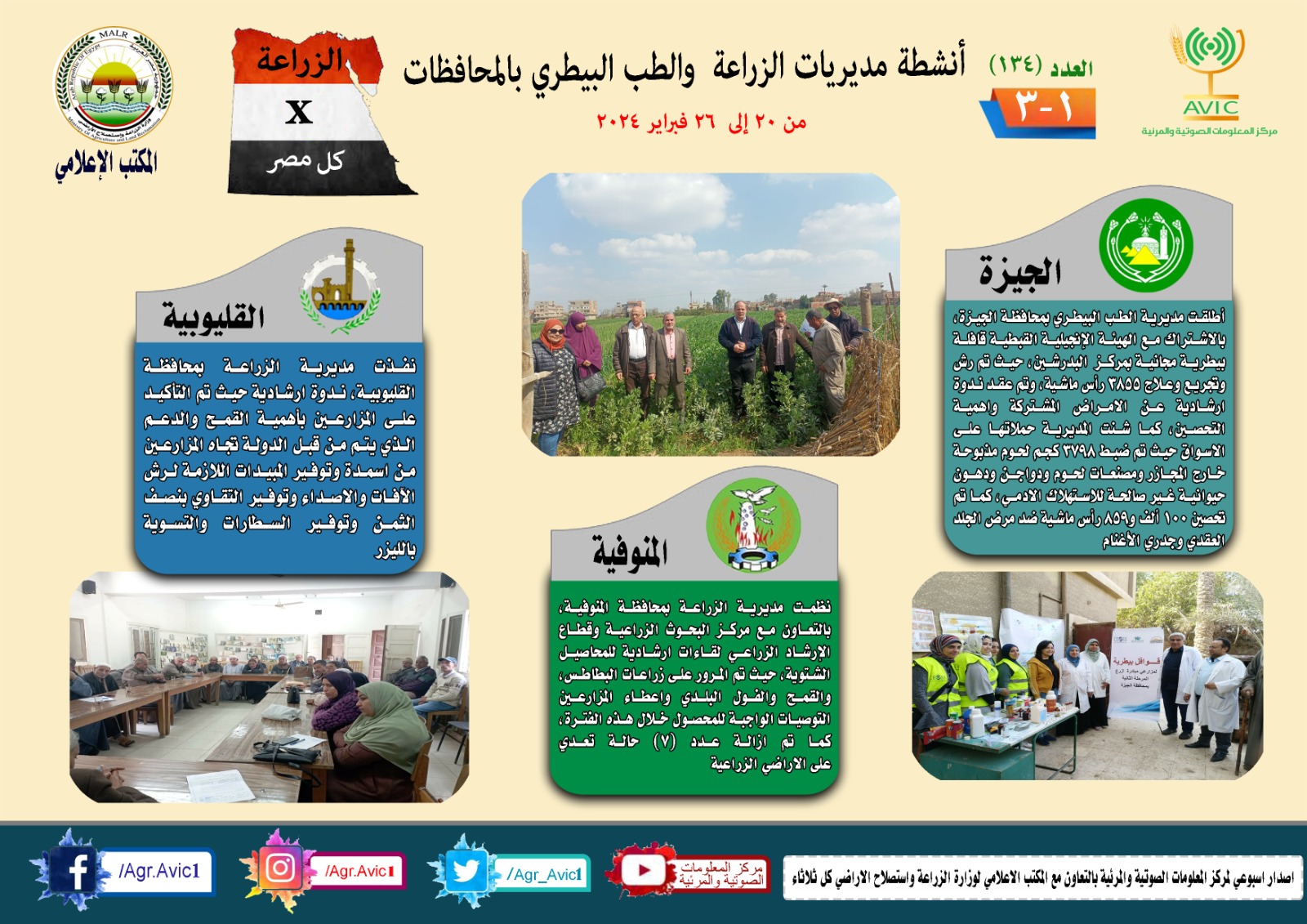 أصدر مركز المعلومات الصوتية والمرئية التابع لوزارة الزراعة واستصلاح الأراضي، والمكتب الاعلامي للوزارة، العدد رقم ١٣٤ من اصدار: "الزراعة في كل مصر" بالانفوجراف والفيديو، يوضح الجهود والانشطة التي تقوم بها مديريات الزراعة والطب البيطري بمحافظات الجمهورية خلال الفترة من ٢٠ وحتى ٢٦ فبراير الجاري.