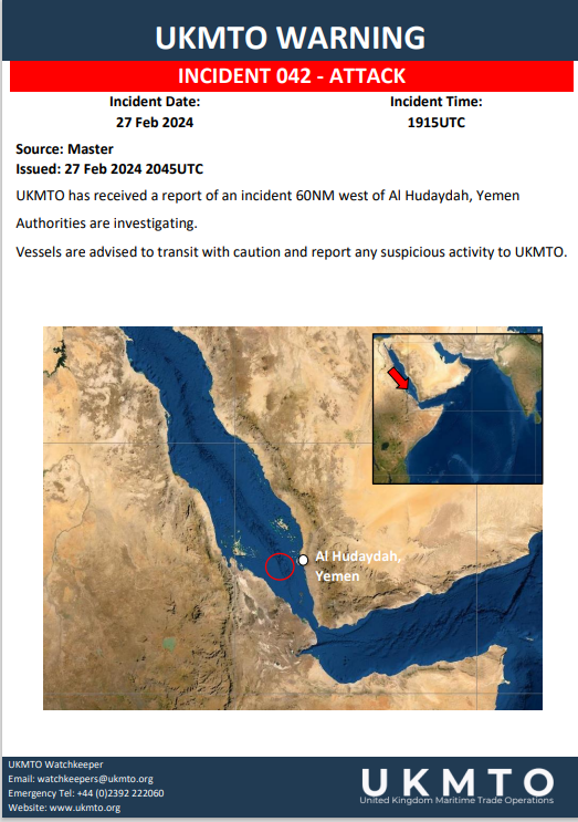 أعلنت هيئة عمليات التجارة البحرية البريطانية، عن وقوع حادث أمني على بعد 60 ميلاً بحريًا غرب الحديدة باليمن.