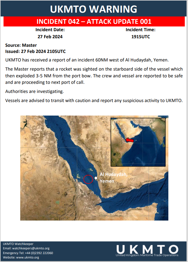 أعلنت هيئة عمليات التجارة البحرية البريطانية، عن وقوع حدث أمني على بعد 60 ميلًا بحريًا غرب الحديدة باليمن.